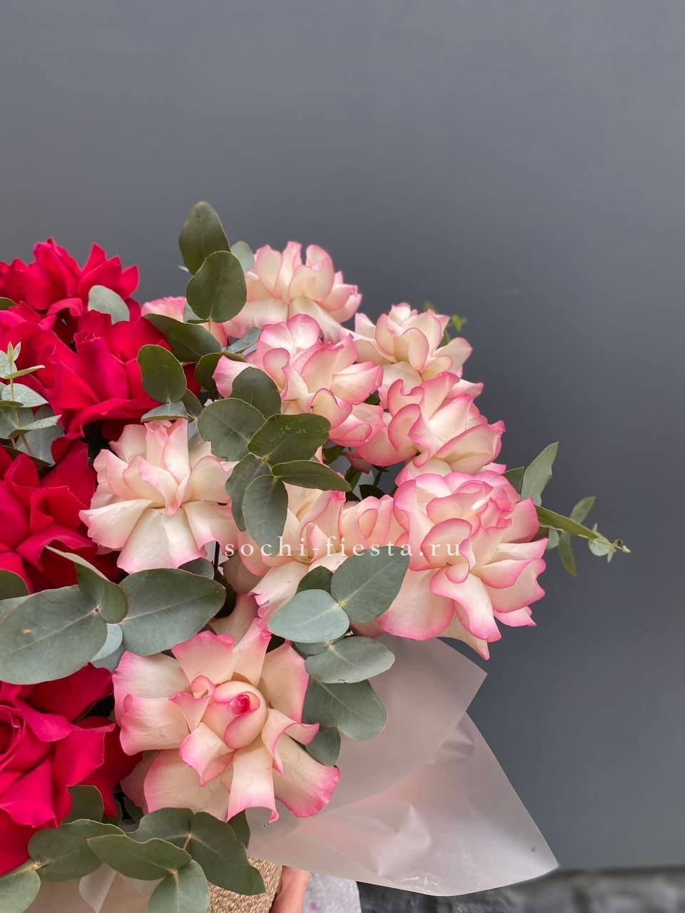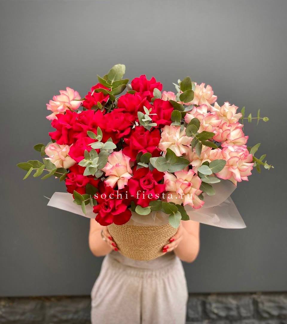 Одиннадцать французских роз выстроены в округлую композицию с веточками эвкалипта. Бутоны крупные и плотные, держат форму и наполняют пространство свежим присутствием.