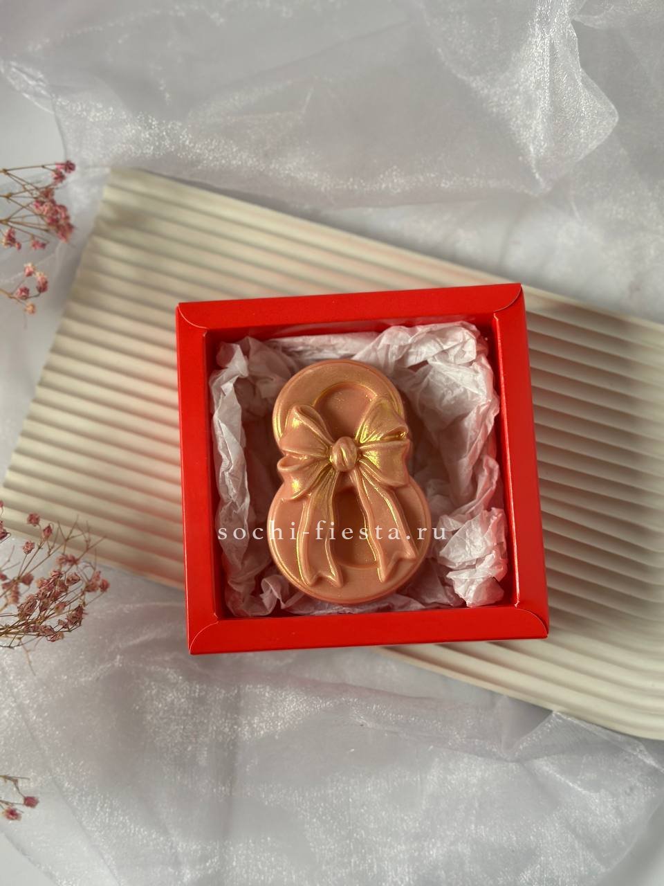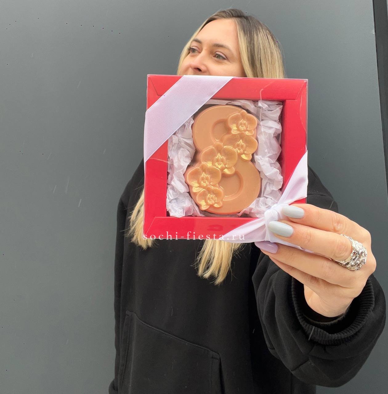 Цифра восемь из белого бельгийского шоколада с авторской росписью. Каждая деталь нанесена вручную, создавая неповторимый узор на гладкой поверхности. Компактная форма и весенняя символика отражают характер момента.