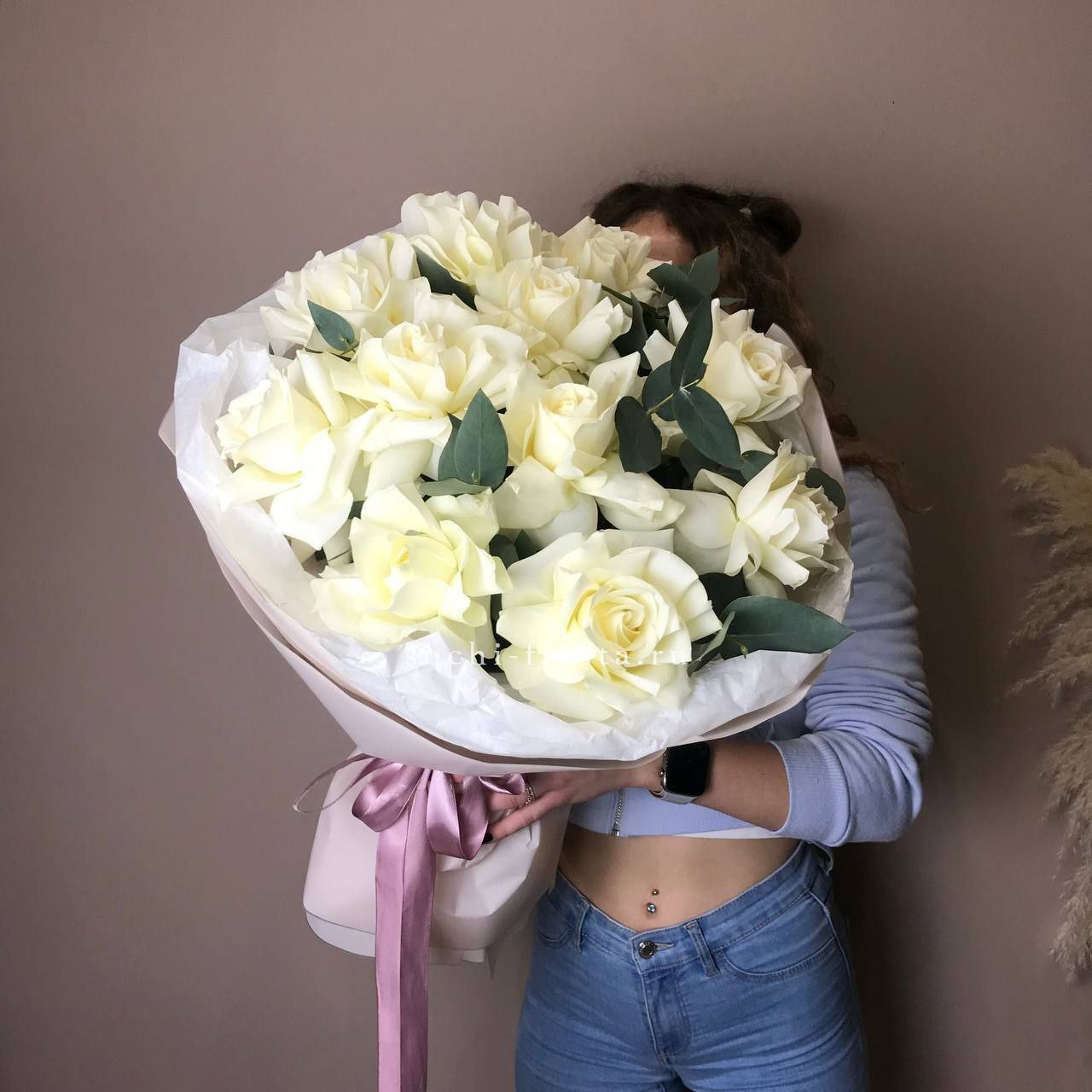 Одиннадцать вывернутых бутонов WhiteNice раскрываются волнами лепестков с матовым свечением. Эвкалипт добавляет воздуха между соцветиями.