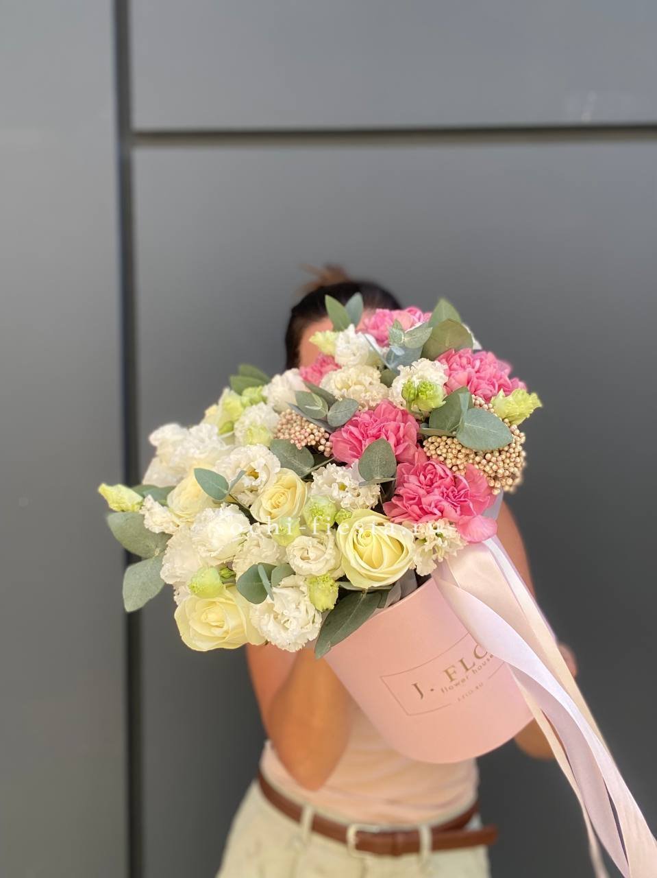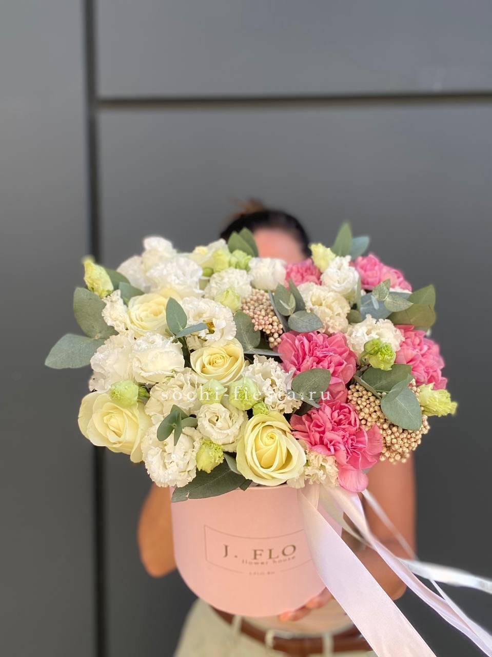 Белые розы встречаются с лиловым диантусом и кремовой эустомой в круглом боксе. Озотамнус и эвкалипт создают фактурный фон для цветочной композиции.