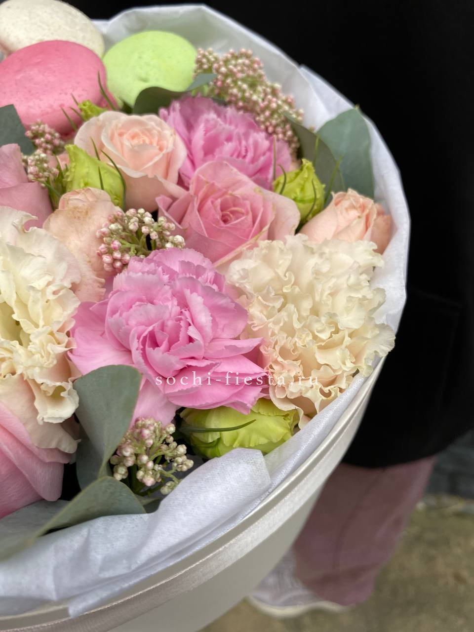 эустома, розы, кустовые розы, диантусы, эустома, озотамнус, макаронс- 6шт., коробка.