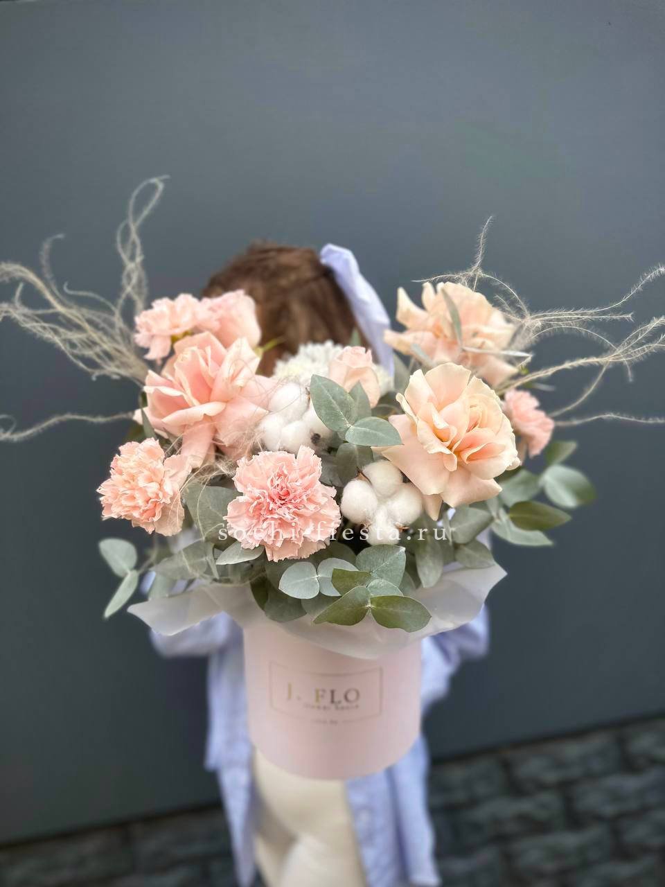 эустома, розы, пионовидные розы, озотамнус или аналог, диантусы, макаронс, декоративная зелень, коробка-сердце.