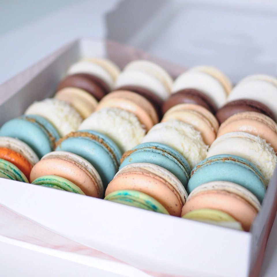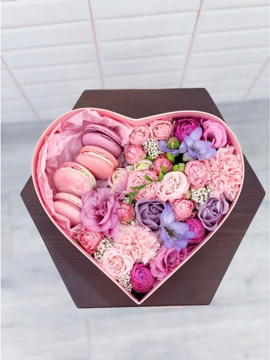 Композиция в форме сердца объединяет свежие бутоны и французские макаронс. Пионовидные розы раскрываются среди эустомы и диантусов, создавая объёмную текстуру с воздушными сладостями.