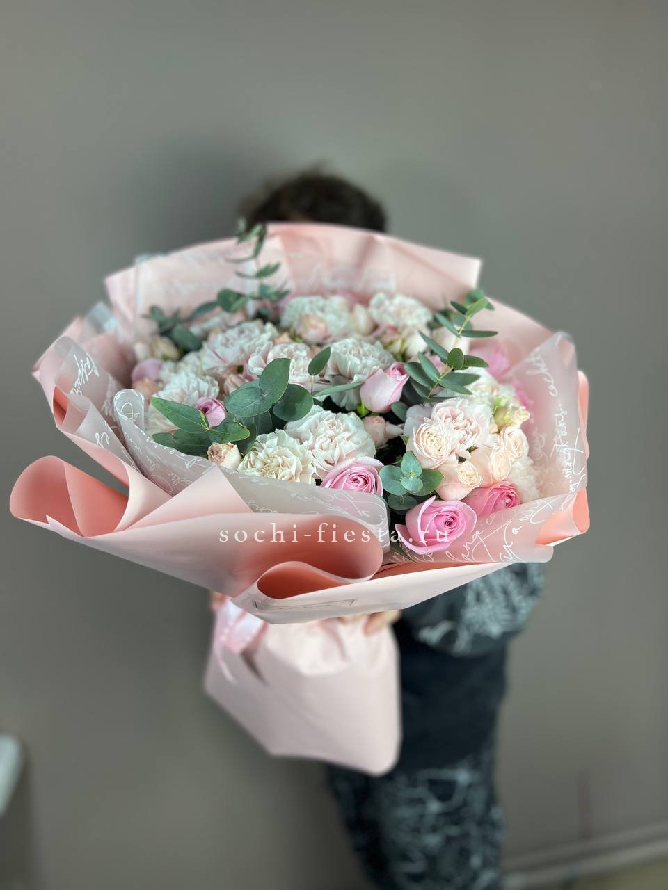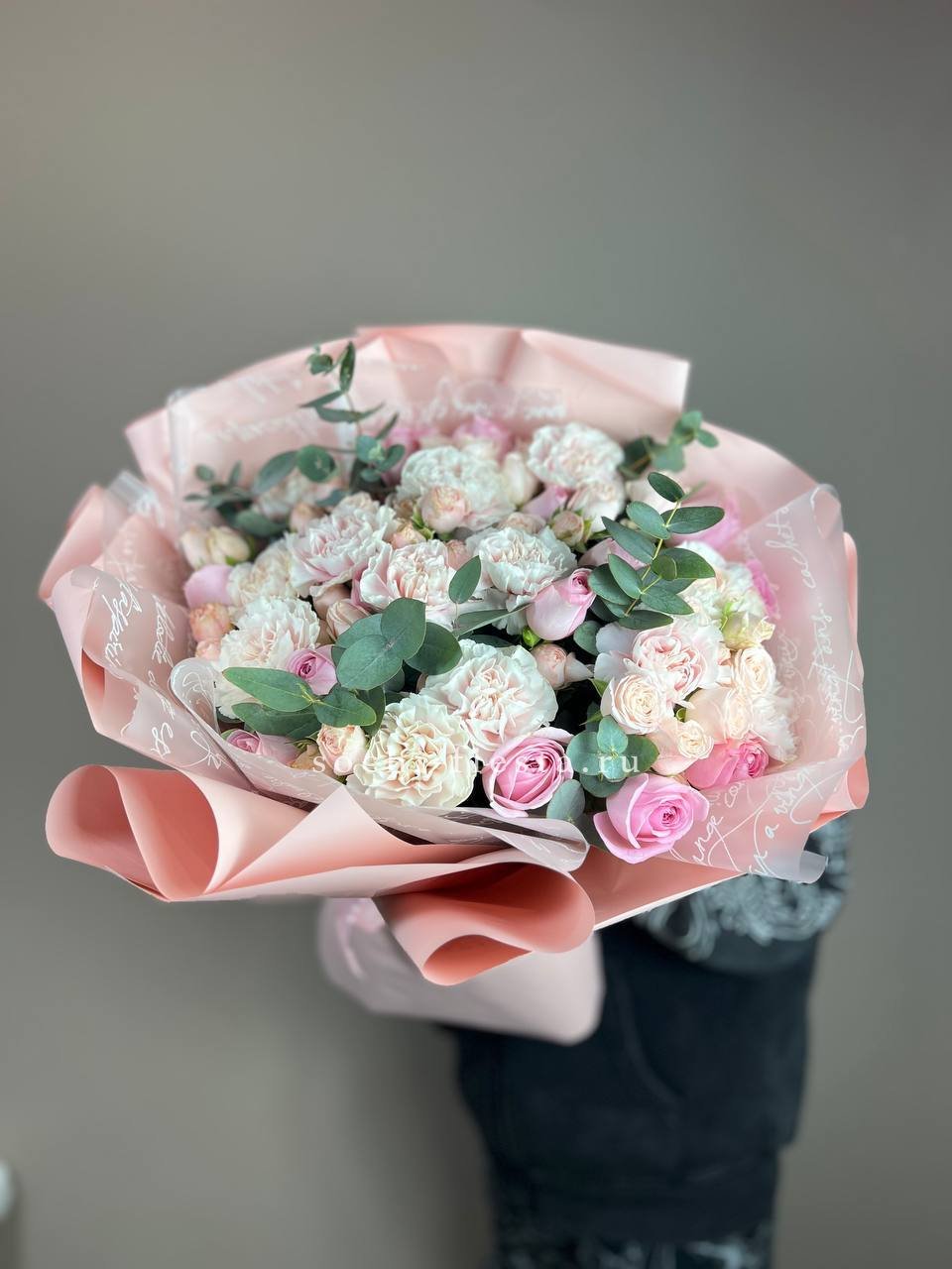 Пышная гортензия соседствует с крупными бутонами роз и многослойной эустомой. Веточки эвкалипта придают свежесть всей композиции. Букет с выразительным объемом и природной гармонией форм.