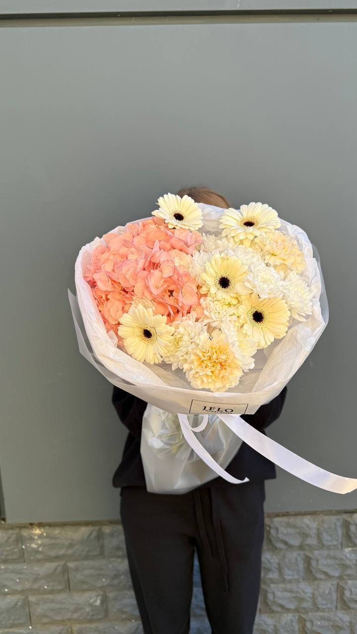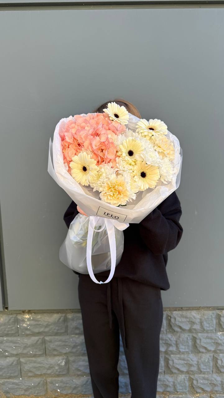 Сочетание воздушной гортензии и классических гербер в одном букете. Этот микс — идеальный баланс между нежностью и стилем. Тот самый подарок, который мгновенно преображает пространство и дарит ощущение праздника. Идеальный выбор для тех, кто вдохновляет на самое лучшее.