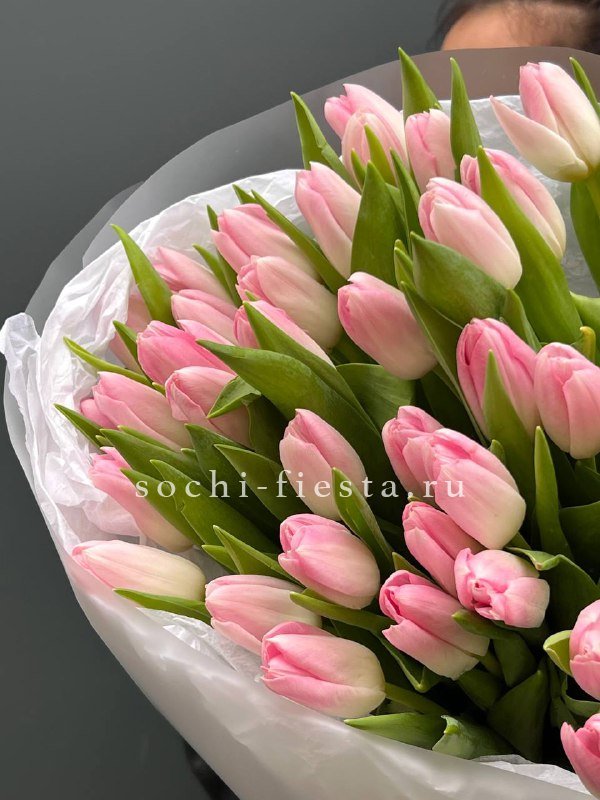 Пышная охапка из полусотни тюльпанов создает объемное облако цвета. Бутоны собраны плотно, образуя живую скульптуру с мягким розовым свечением. Такая композиция меняет восприятие пространства вокруг.