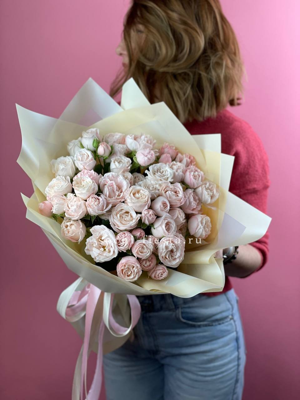 вывернутые розы, гортензия, пионовидные розы, эустома, лента, авторская упаковка.