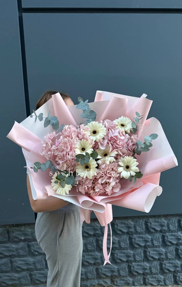 Гортензия создаёт воздушную базу, а герберы добавляют яркие точки цвета. Эвкалипт заполняет пространство между бутонами и придаёт композиции завершённость. Букет выглядит свежо и легко.