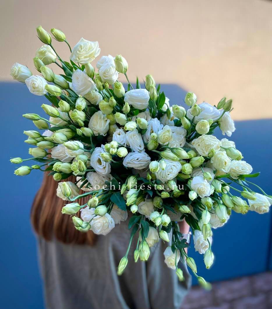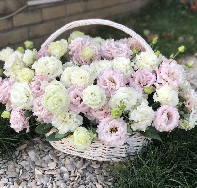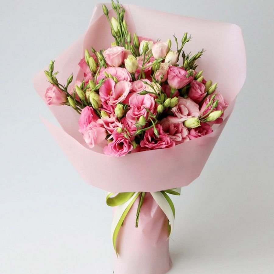 Пятнадцать воздушных эустом собраны в пудровое облако с мягкими переходами оттенков. Многослойные бутоны создают объёмную текстуру и удивительную глубину композиции.