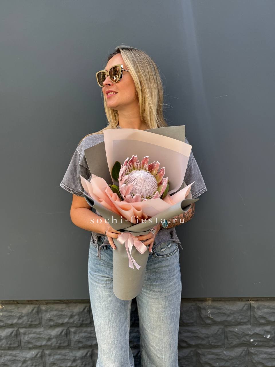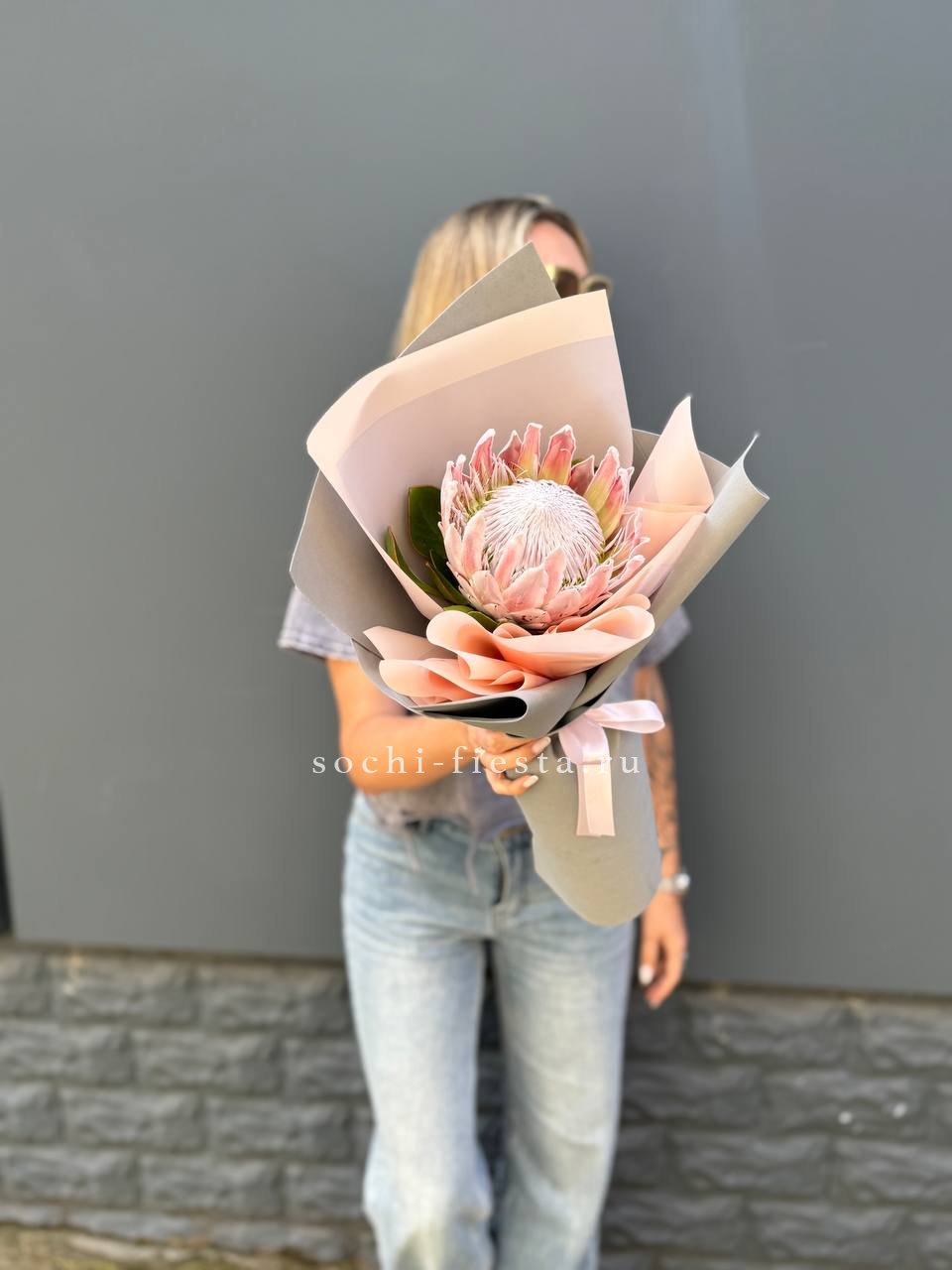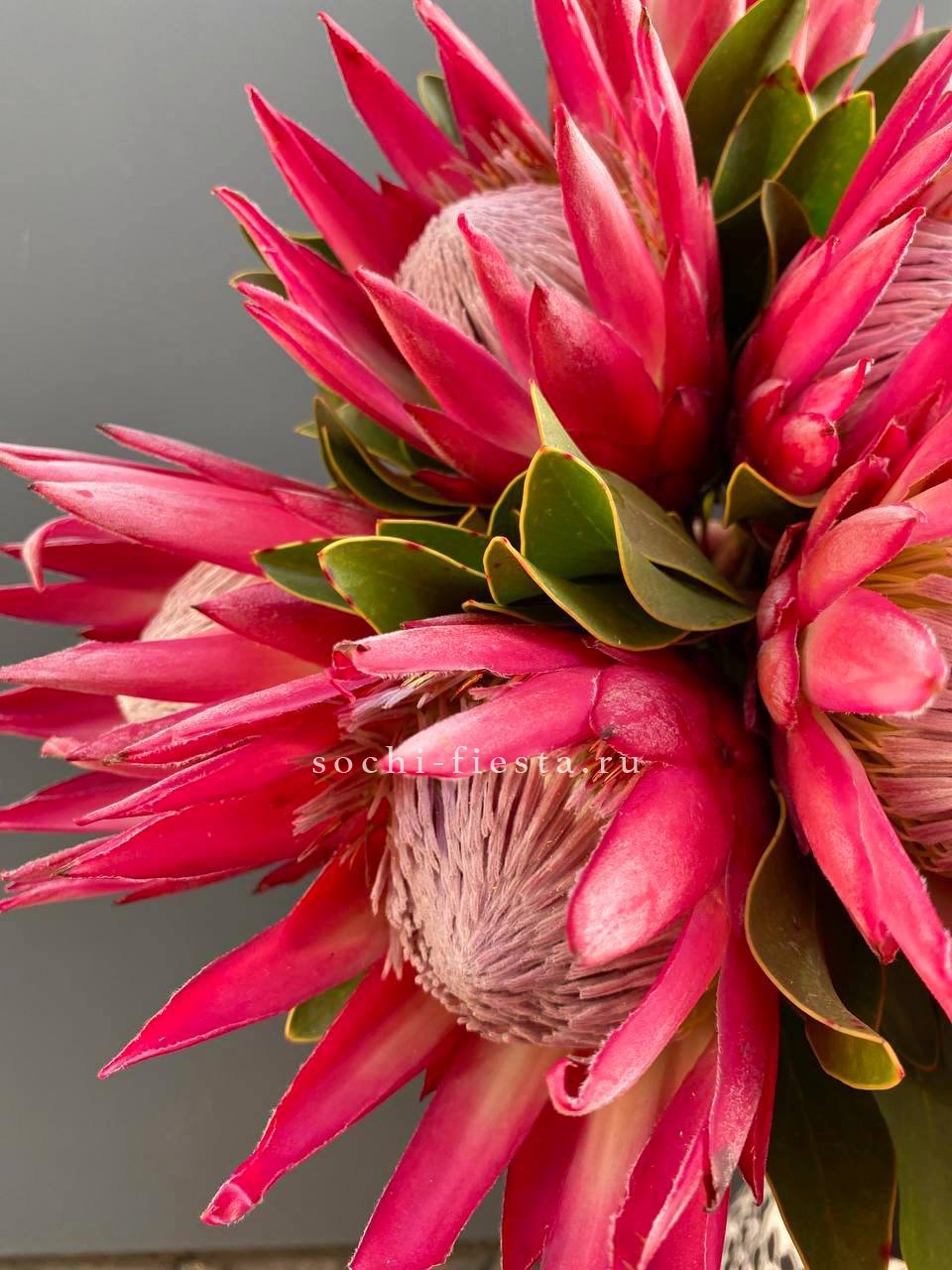 Экзотический цветок с плотной головкой и графичными лепестками привлекает внимание необычной архитектурой. Протея хороша в монобукетах и авторских композициях, где важна выразительная форма и долгая свежесть.