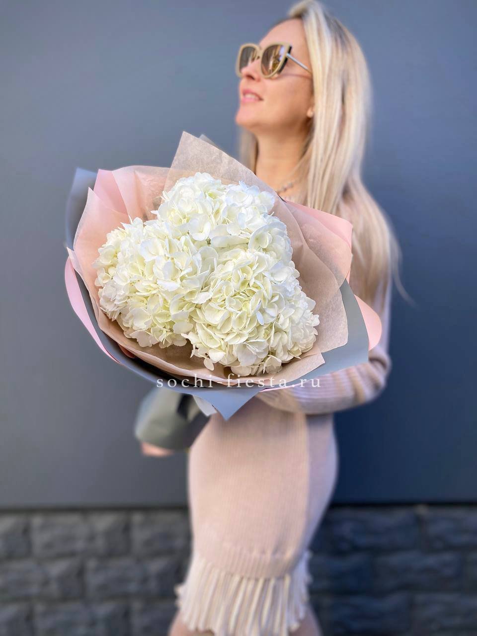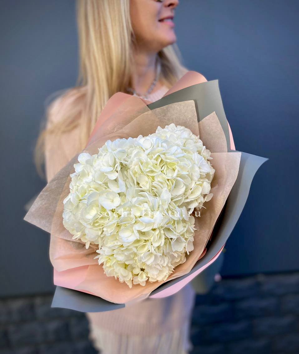 Двадцать пять соцветий гортензий разных оттенков формируют пышное облако с естественной игрой цвета. Каждая головка раскрывается по-своему, создавая живую фактуру без четких границ между тонами.