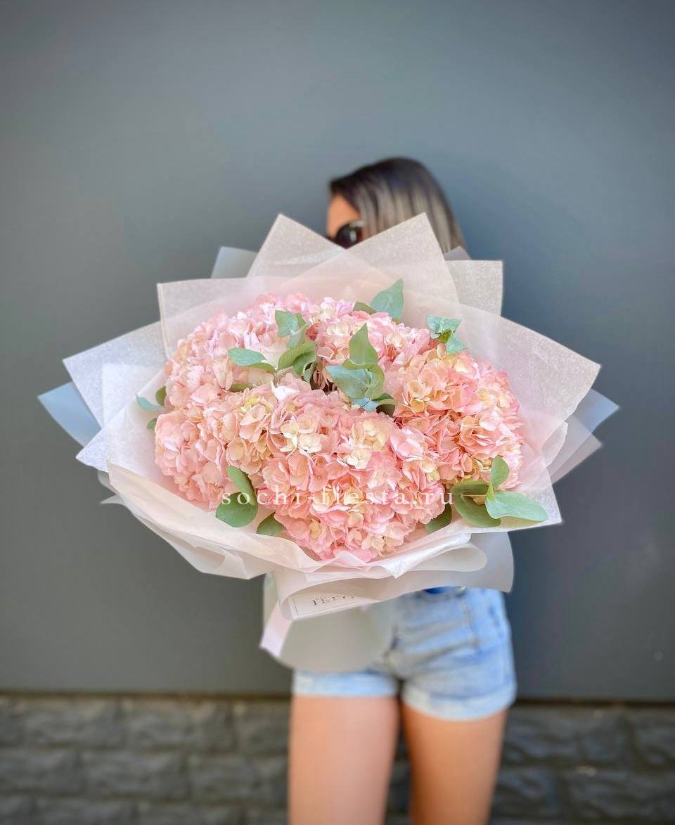 гортензия розовая 9шт., лента, дизайнерская упаковка. Цвет гортензий может незначительно отличаться.