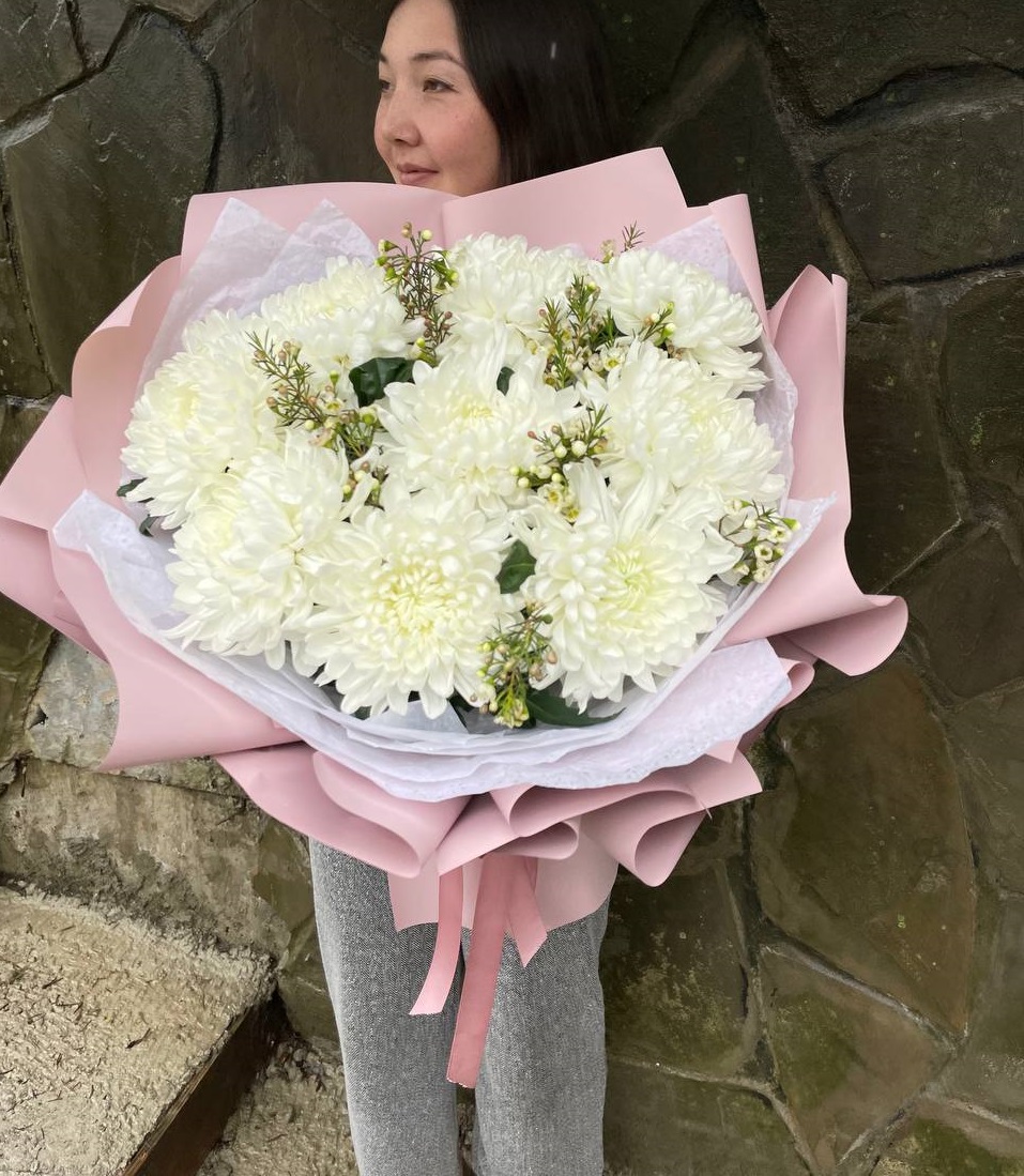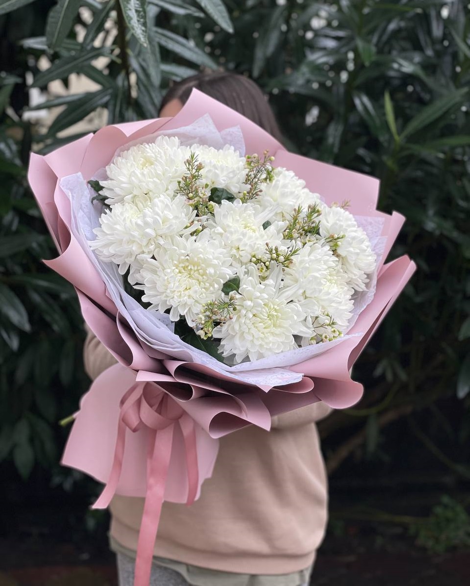 Пять веток кустовой хризантемы с множеством соцветий создают пышную воздушную массу. Букет напоминает утренний сад, где каждая ветка живёт своим ритмом и дарит ощущение лёгкости.