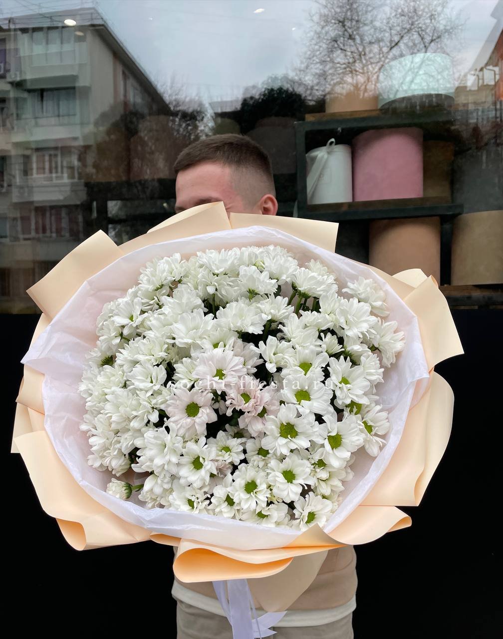 хризантема кустовая - 17 веток, тишью, дизайнерская упаковка, лента.