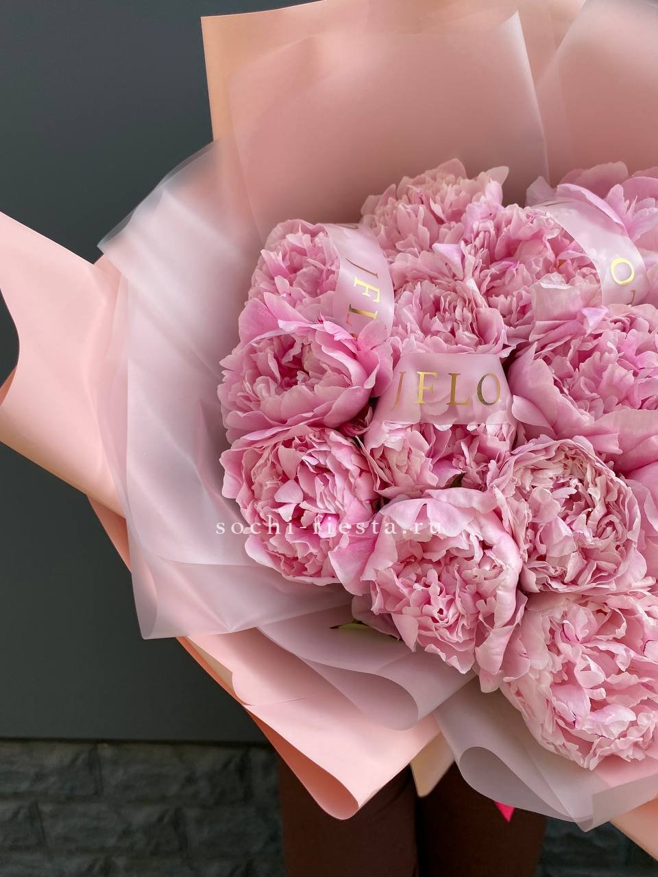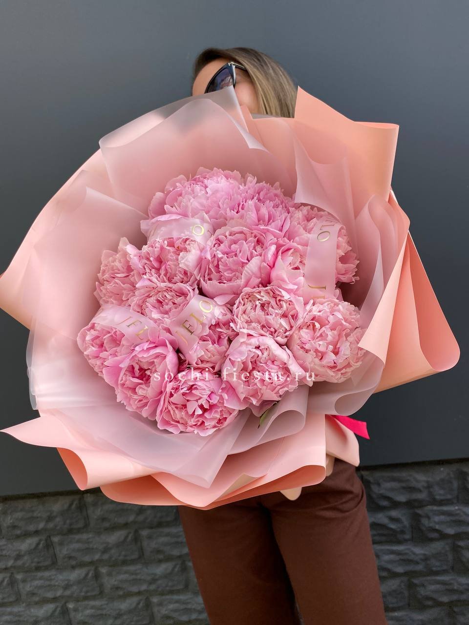 15 розовых местных пионов, лента, комбинированное оформление.