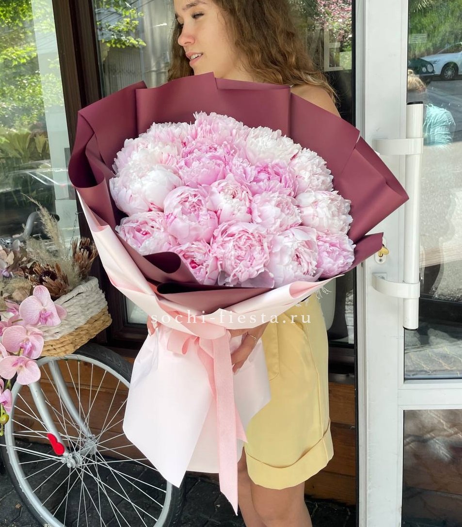 17 пионов, лента, дизайнерская упаковка.