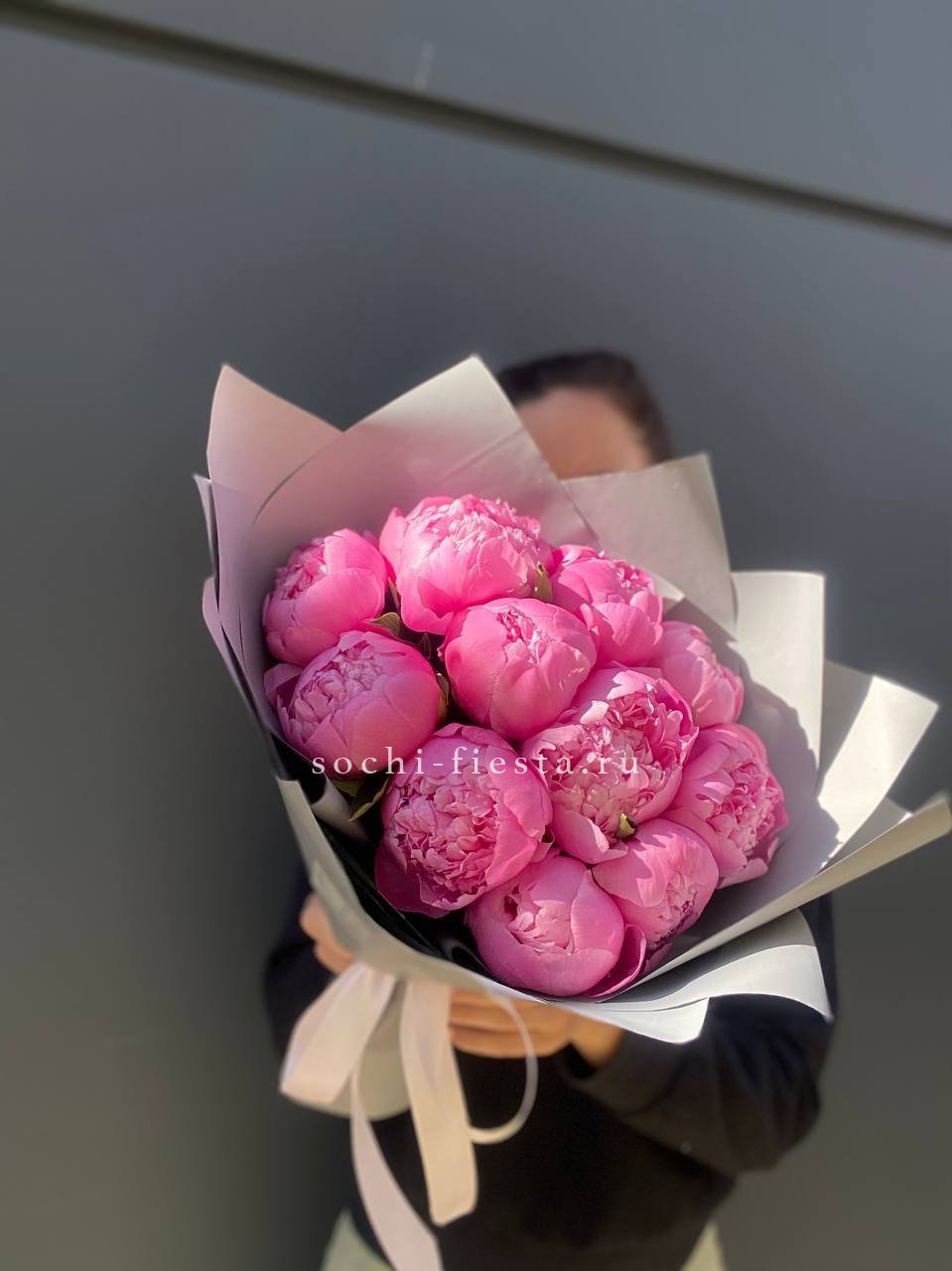 розовые пионы, лента, упаковка.