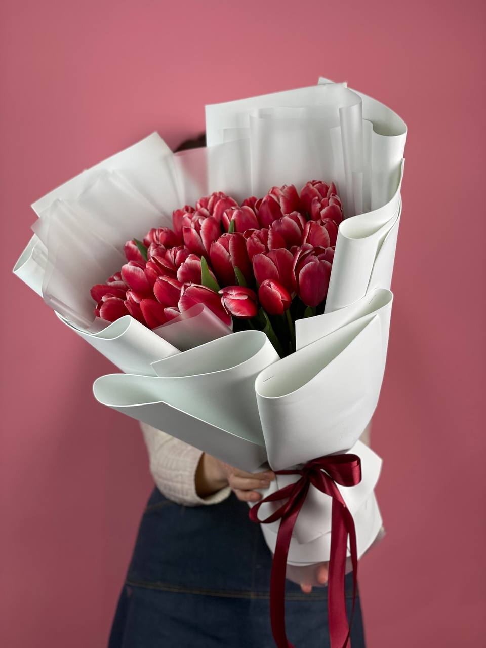 изначальная цена указана за букет из 15 тюльпанов Состав букета на фотографии: 35 тюльпанов, лента, упаковка.