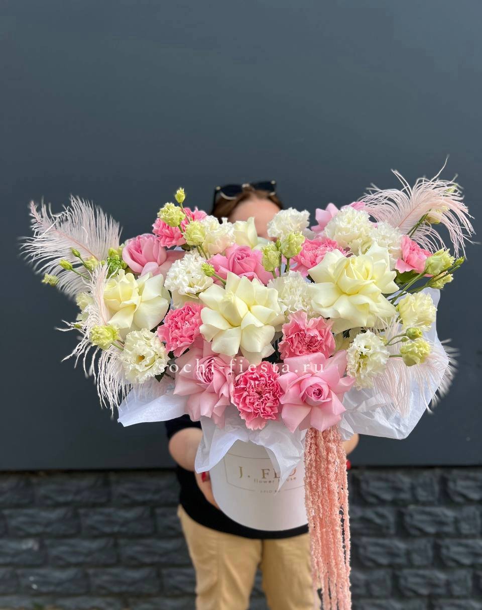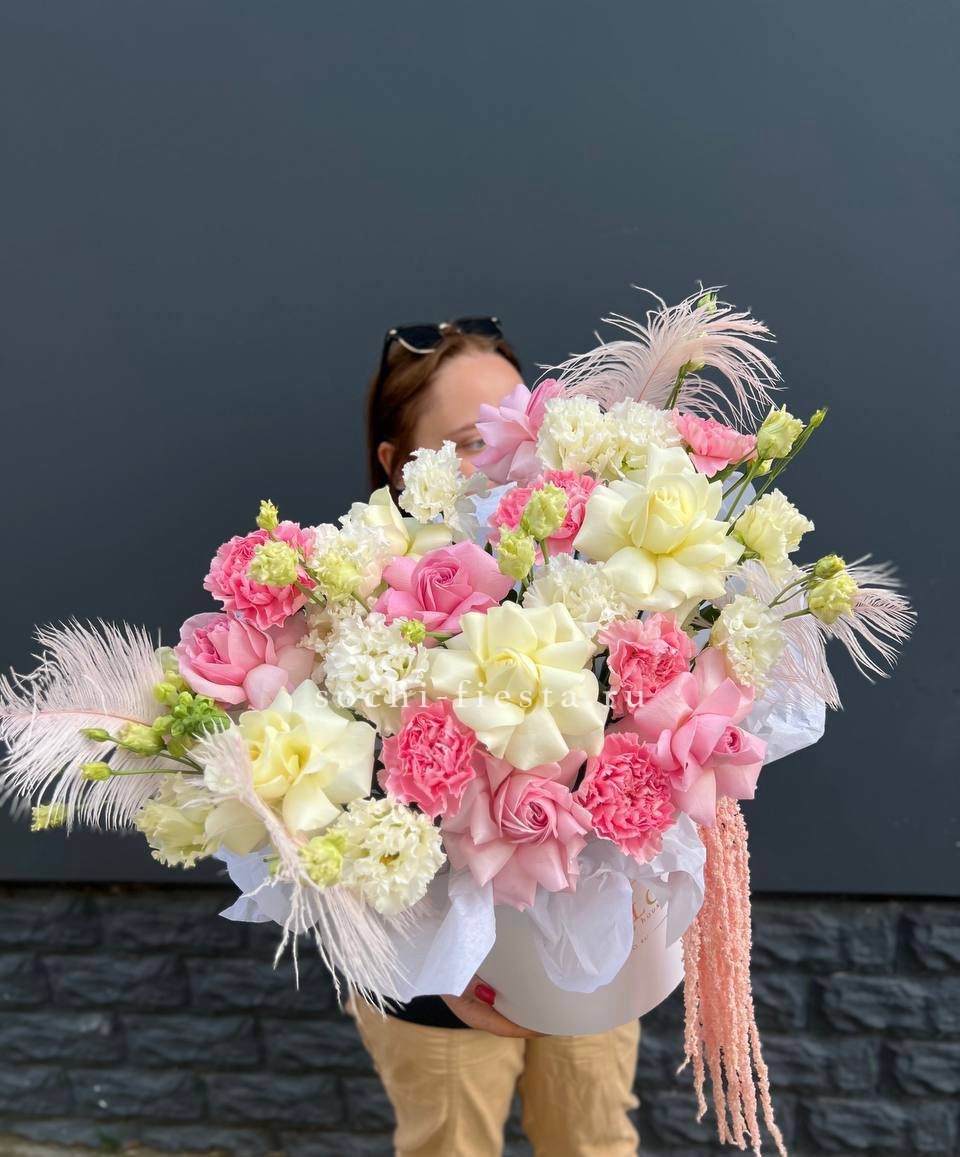 Сочетание вывернутых роз с гортензией, диантусами, розами, бомбастиками создает воздушных элегантный образ идеального цветочного подарка