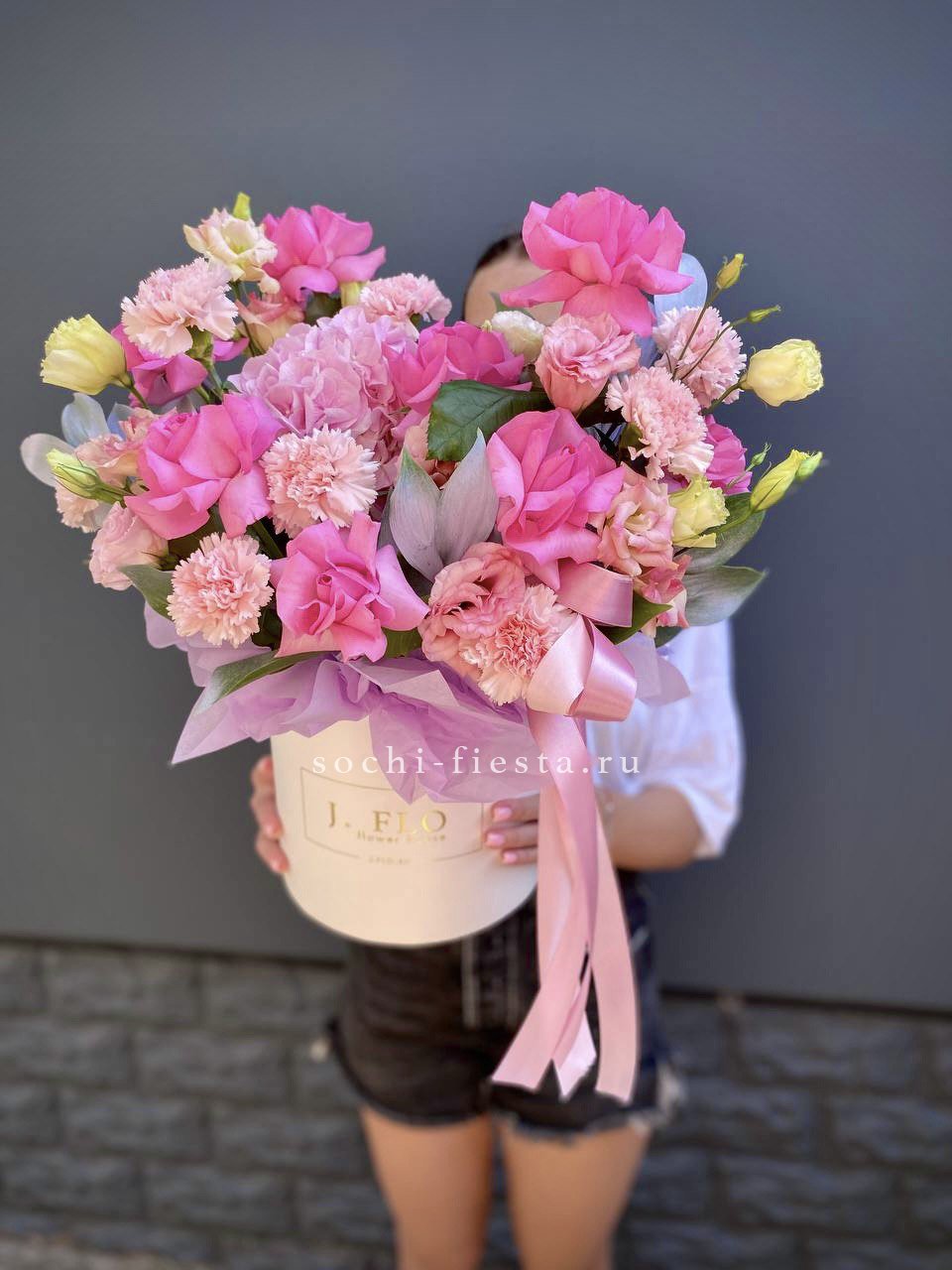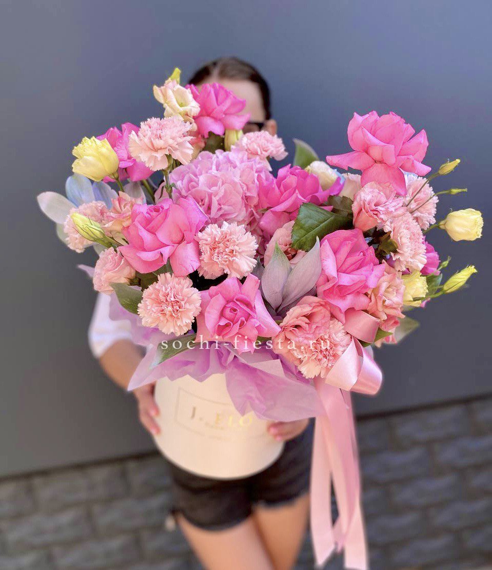 Пионовидные розы и крупные соцветия гортензии создают объёмную текстуру с мягкими переходами оттенков. Экзотическая гербера и диантус добавляют графичности, а воздушный аспарагус разбивает плотность композиции лёгкими штрихами.
