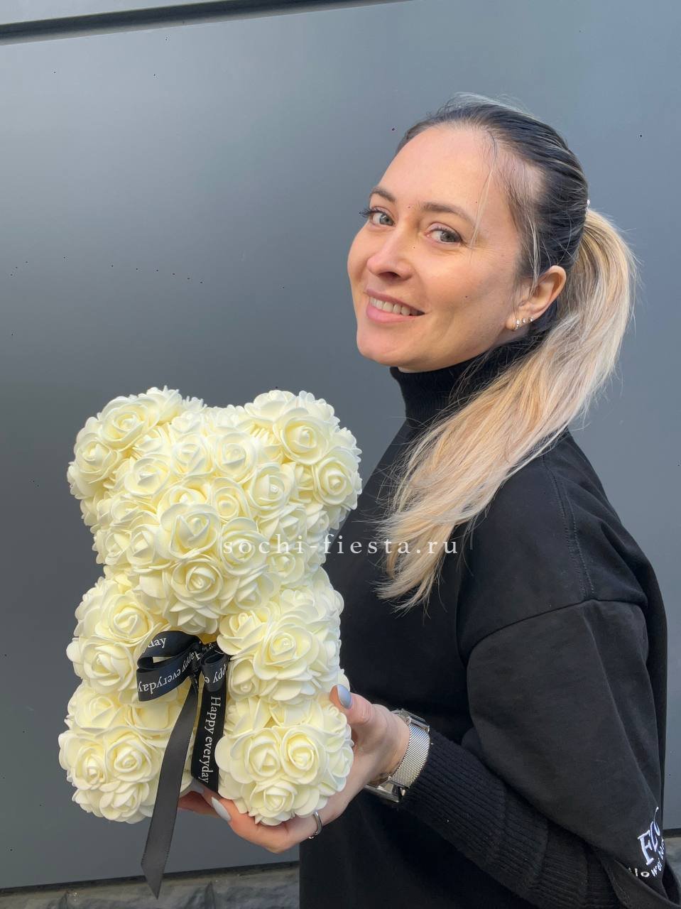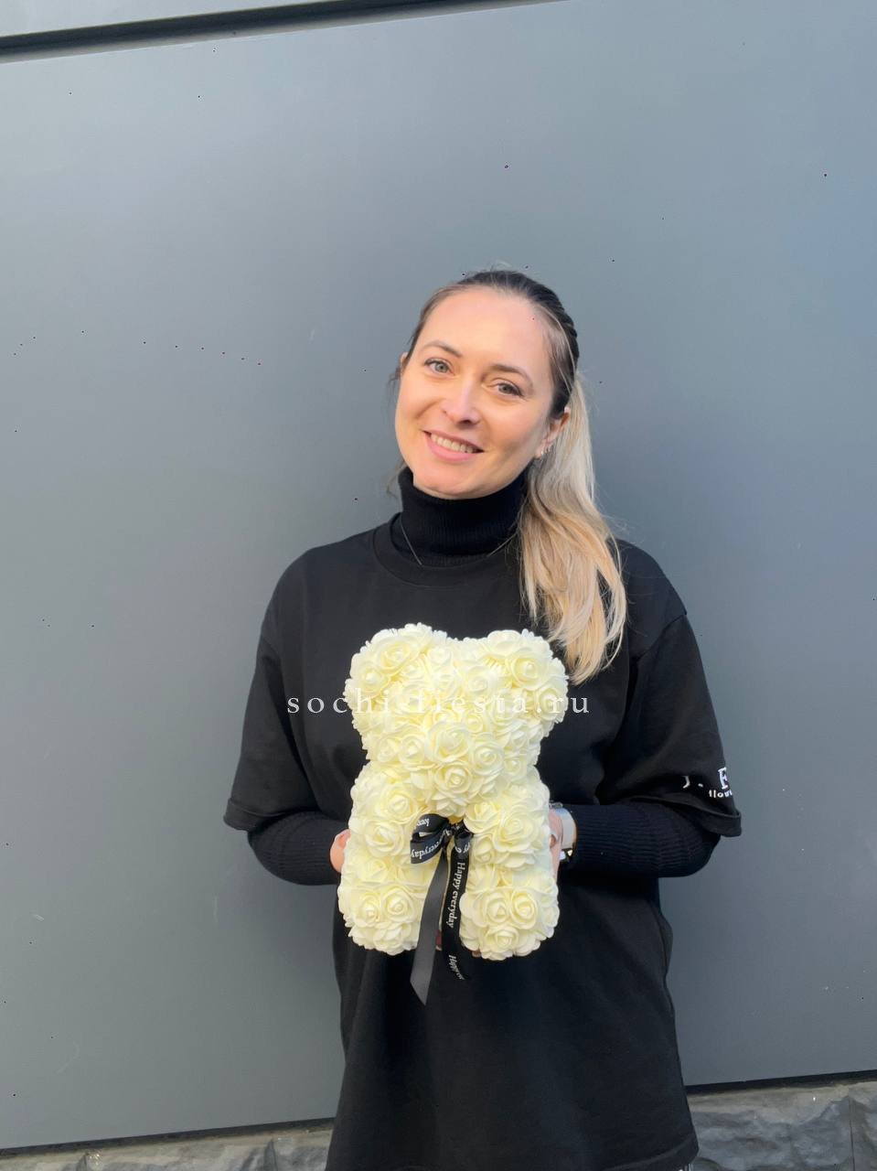 Белый медведь из фоамирана в оттенке шампань напоминает облако из мелких бутонов. Плотная структура материала держит форму и сохраняет первоначальный вид надолго.