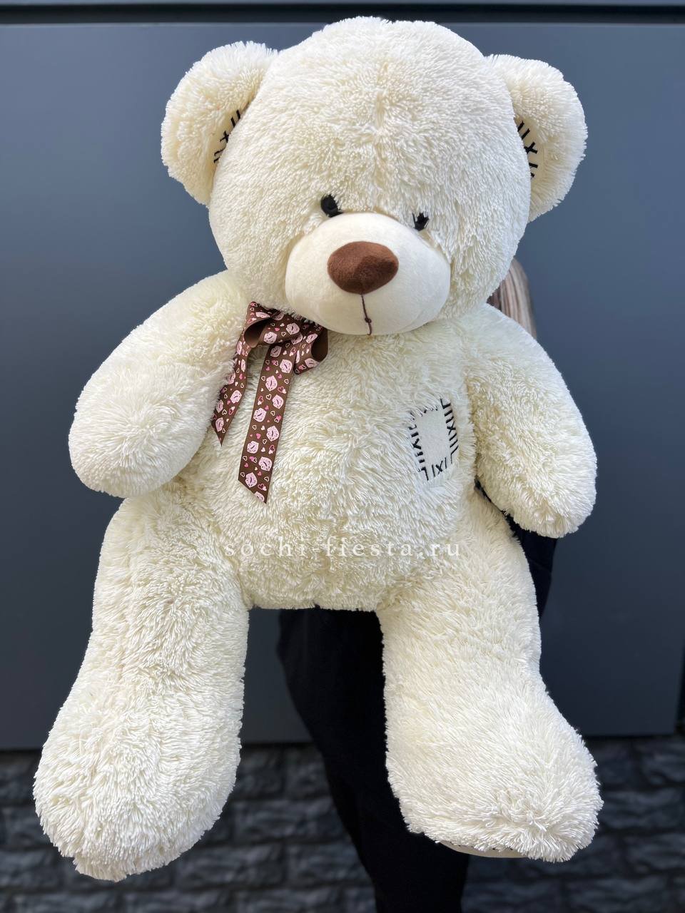 Мягкий плюшевый мишка метровой высоты с густым ворсом и добродушной мордочкой. Объемная фигура с крепкими лапами и округлыми формами создает ощущение уюта и надежности в любом пространстве.