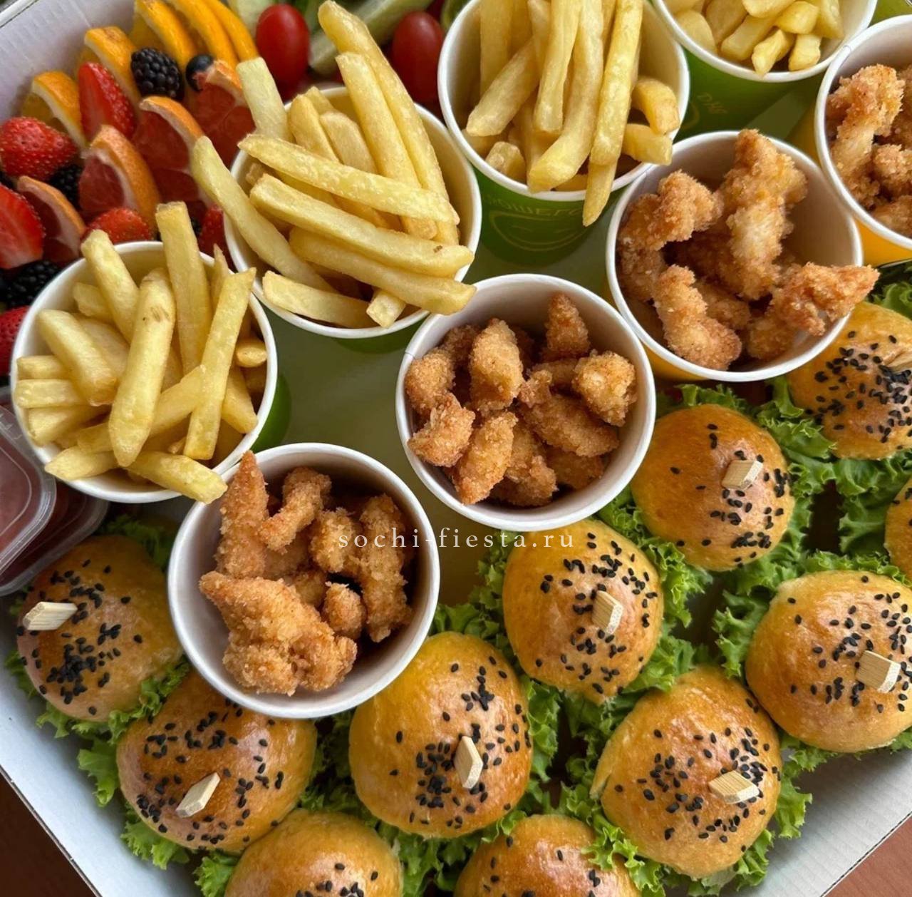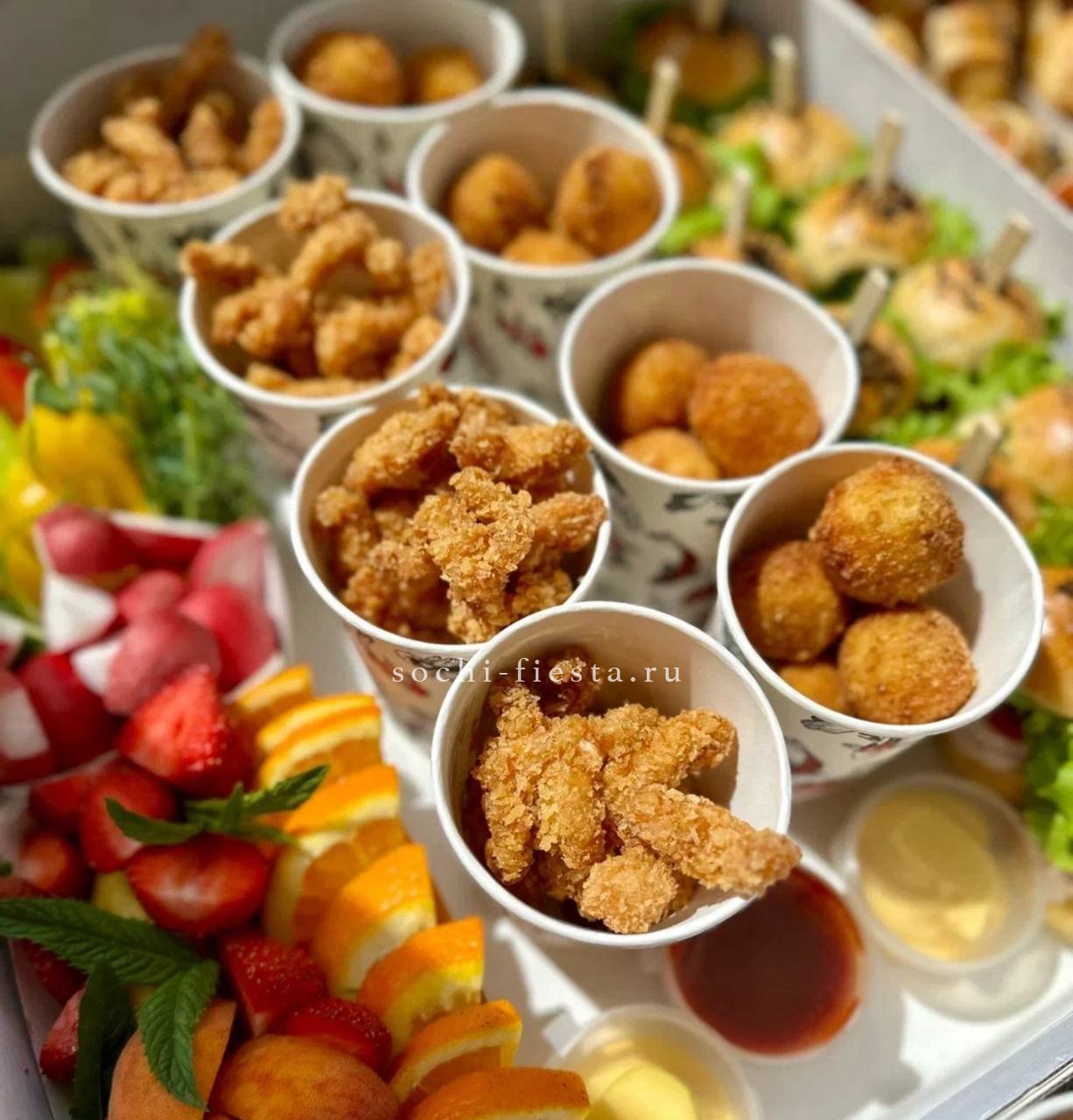конвертики с овощами и ветчиной- 5 шт. Мини тосты с лососем, редисом и лимоном- 5 шт. Тарталетки с рийетом из лосося- 5 шт. Яйцо в пикантной начинкой из сыра- 5 шт.