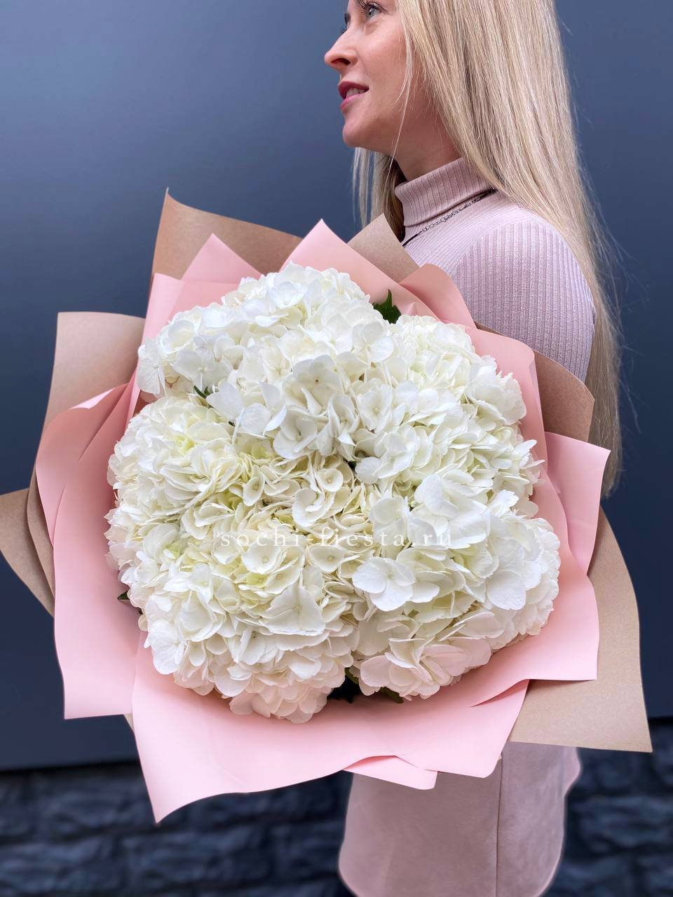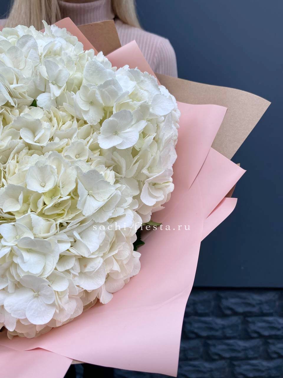 Семь белоснежных соцветий собраны в плотный объёмный силуэт. Гортензии Flakes создают ощущение летней свежести и спокойной гармонии. Монобукет для тех, кто ценит чистоту формы и природную красоту.