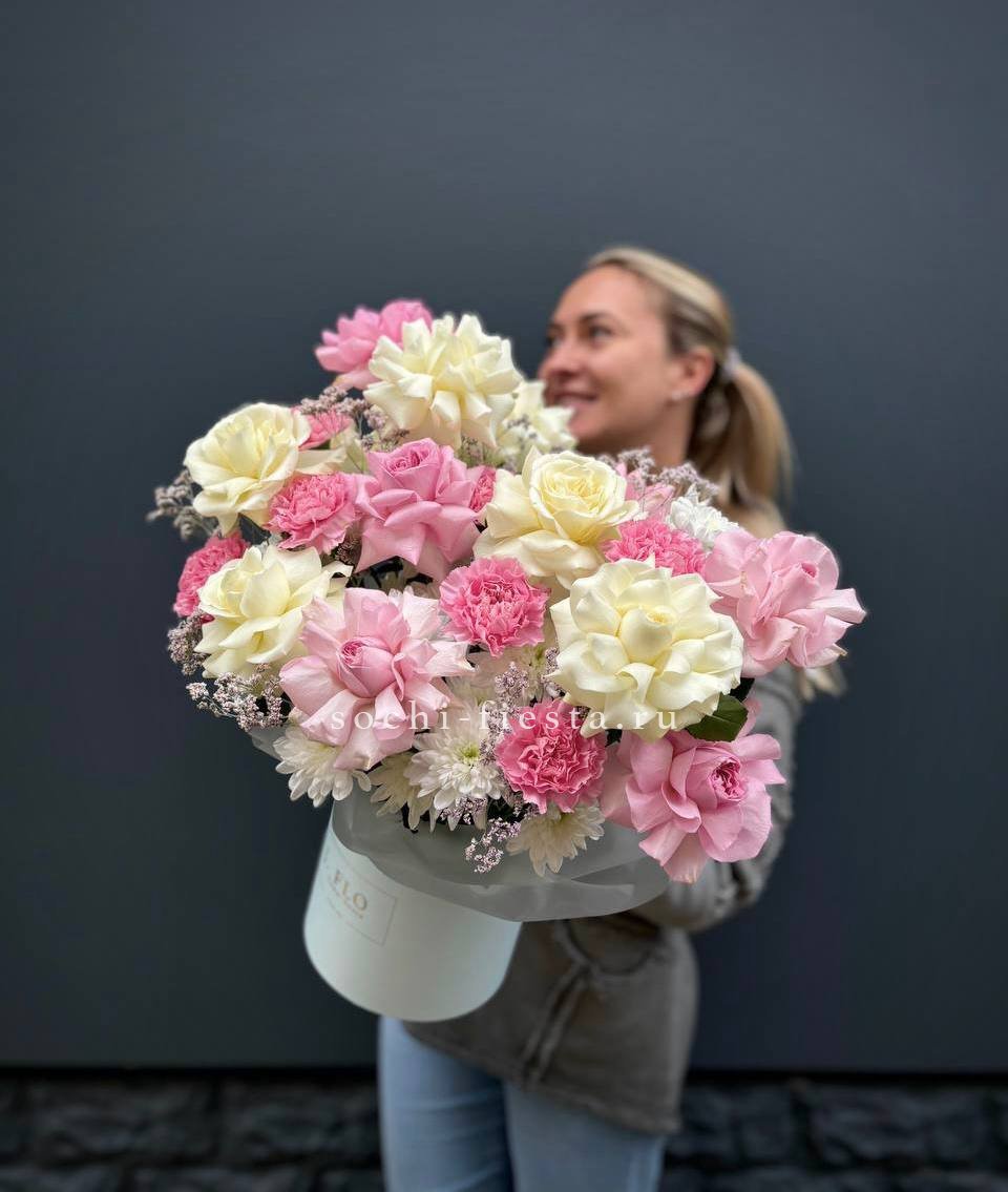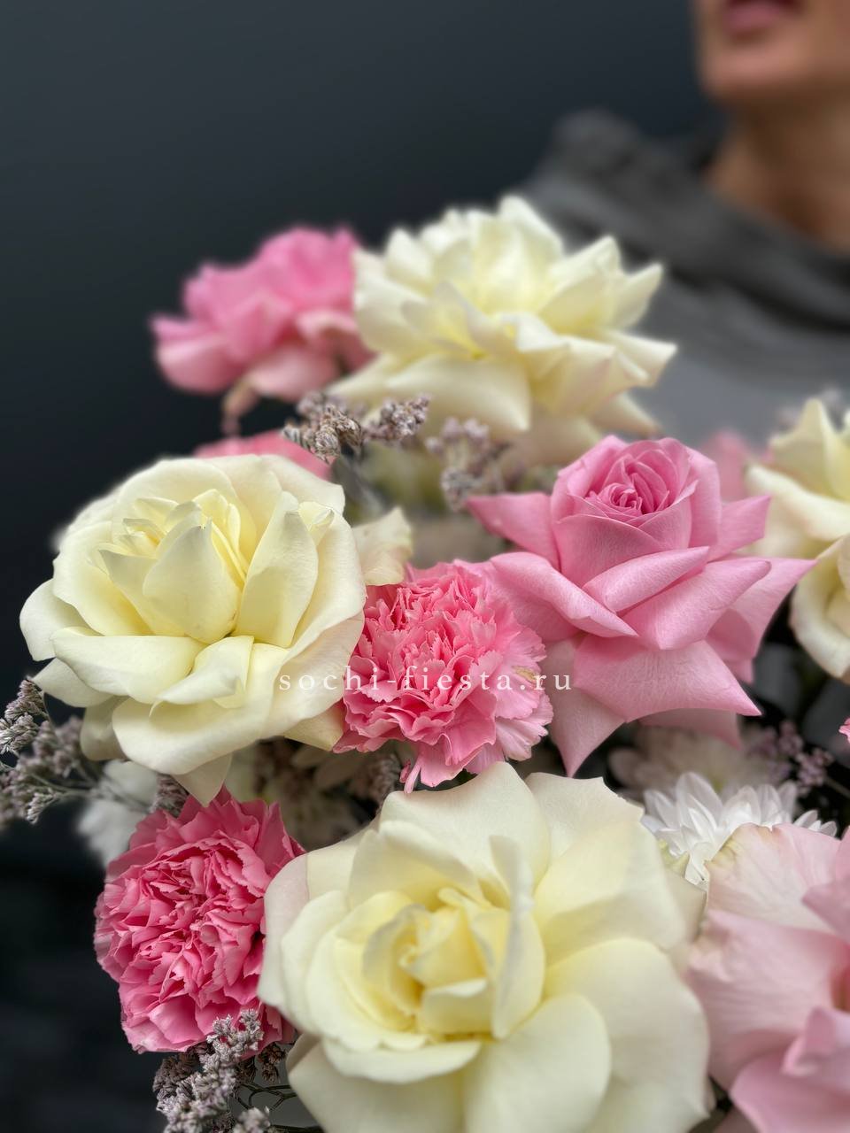 Для заказа товара "Коробка французских роз и диантусов "Бони"" с доставкой в Грозные нажмите в корзину