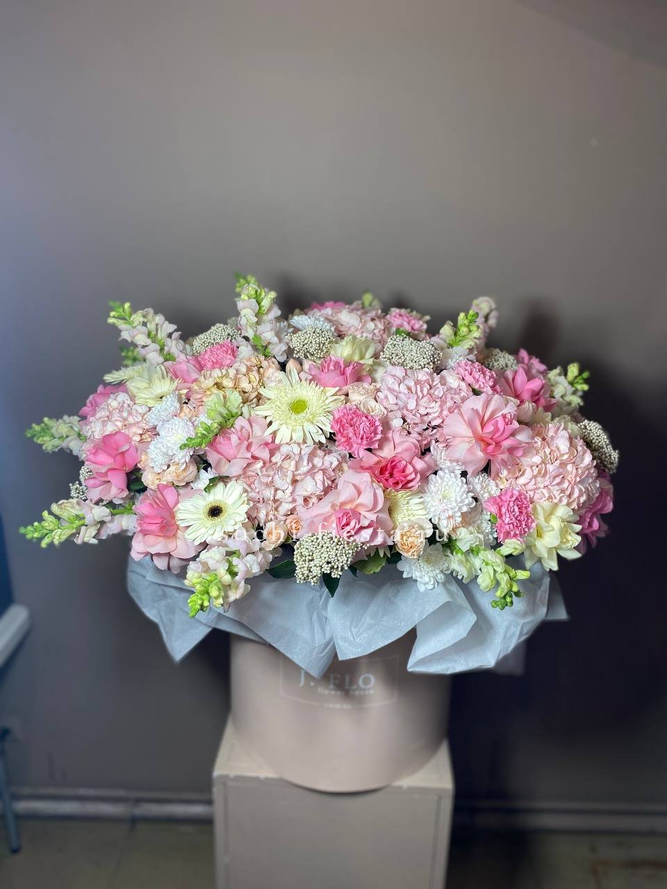 хризантемы, герберы, розы, антиринум, диантус, гортензия, бомбастик, озатамус в коробке или корзине на выбор.