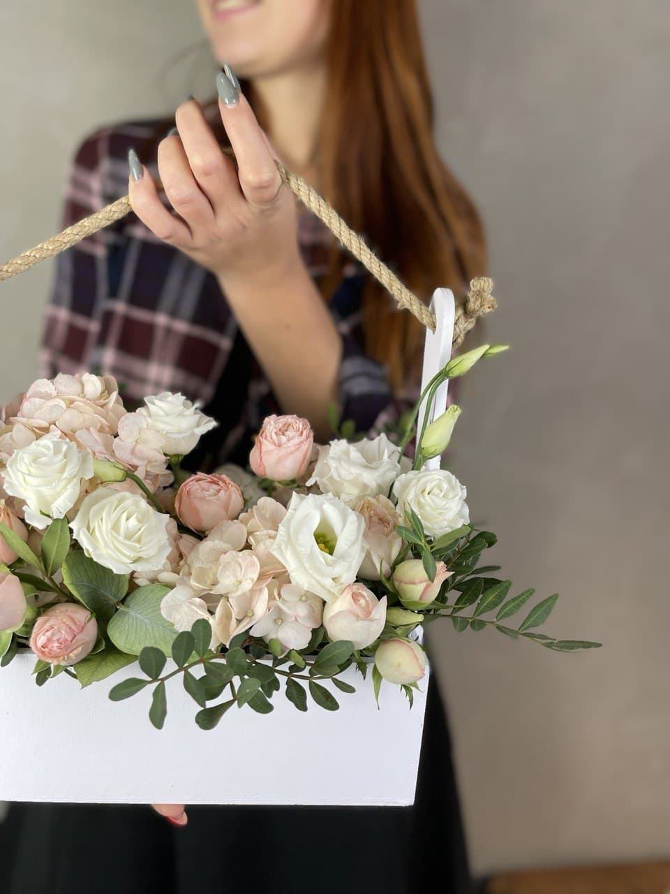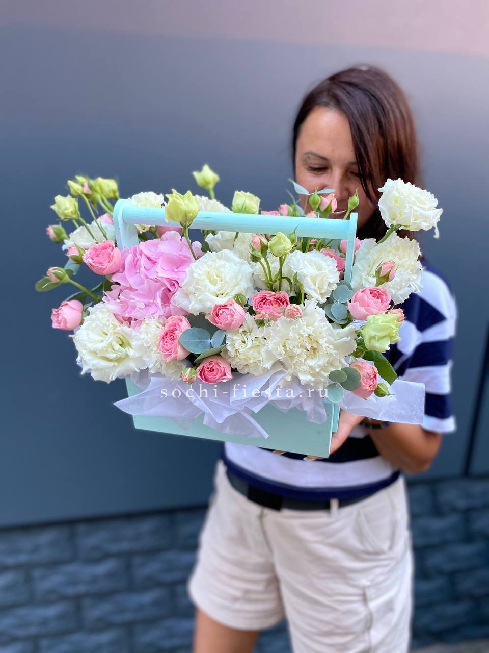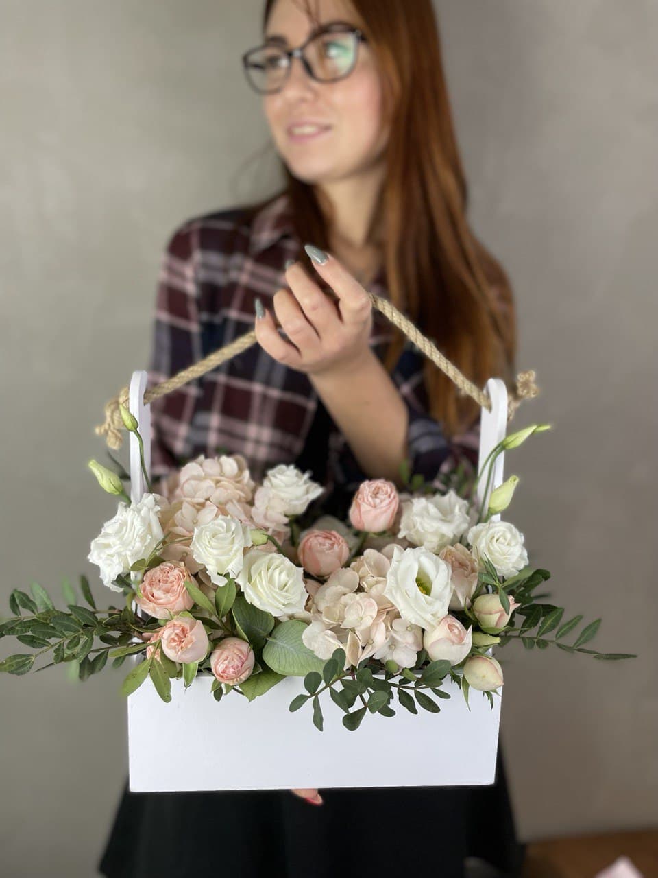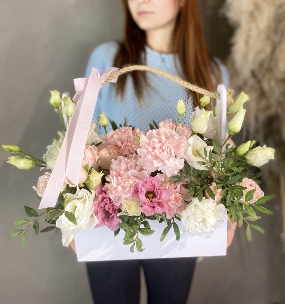 розы, диантусы, эустома, деревянный ящик с колбами.