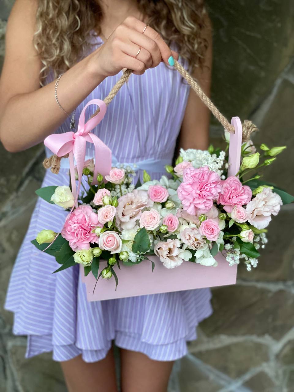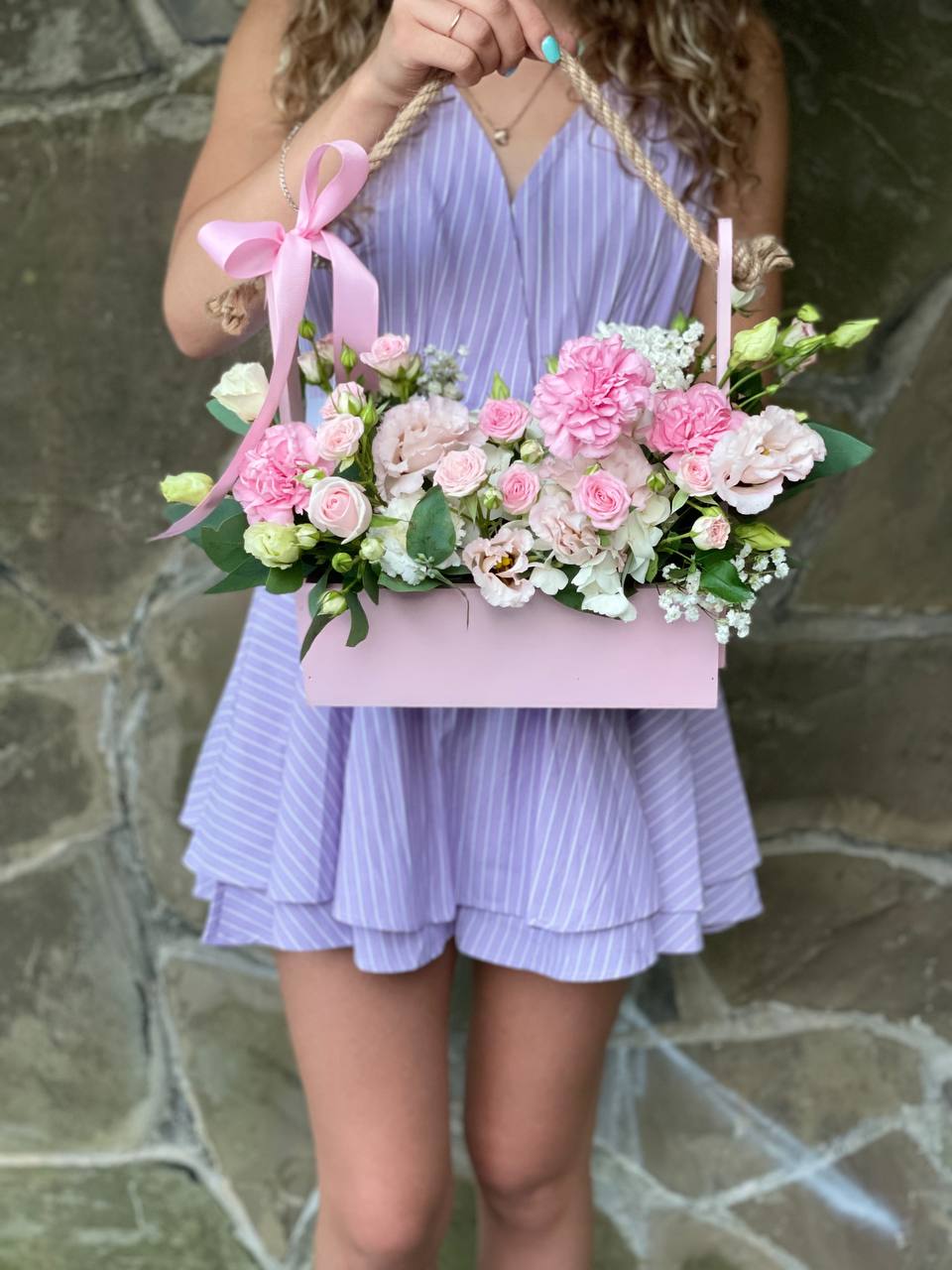 Яркие головки диантусов и пышная эустома создают живую композицию в деревянном ящике. Розы добавляют объём и насыщенность цвета. Формат с колбами сохраняет свежесть надолго.