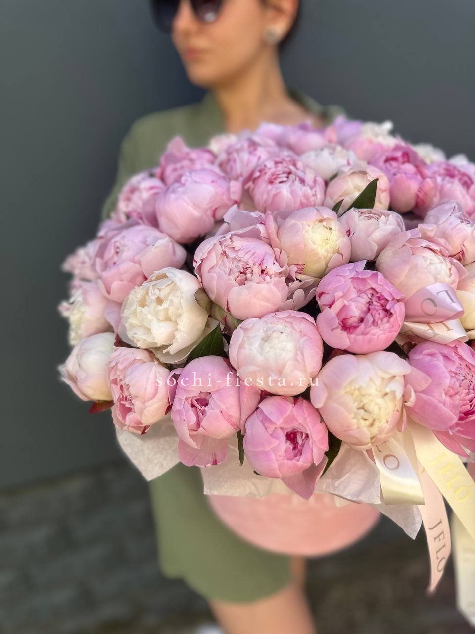 Пятьдесят один пион в цилиндре раскрывается волнами: от туго свёрнутых бутонов до пышных головок с вывернутыми лепестками. Каждый цветок живёт своим ритмом, создавая живую фактуру. Композиция дышит и меняется.