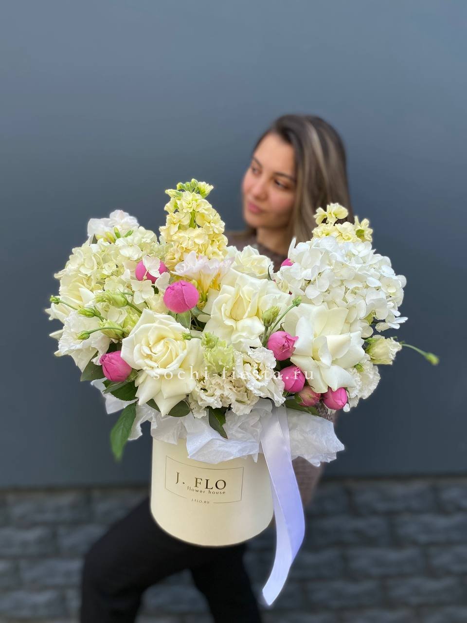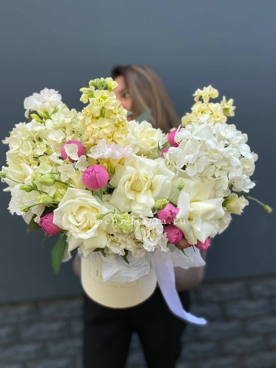 Французские розы раскрываются крупными бутонами рядом с воздушной эустомой и пушистой гортензией. Маттиола наполняет композицию тонким ароматом.