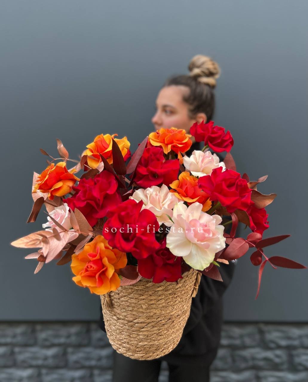 французские розы, эвкалипт, кашпо.