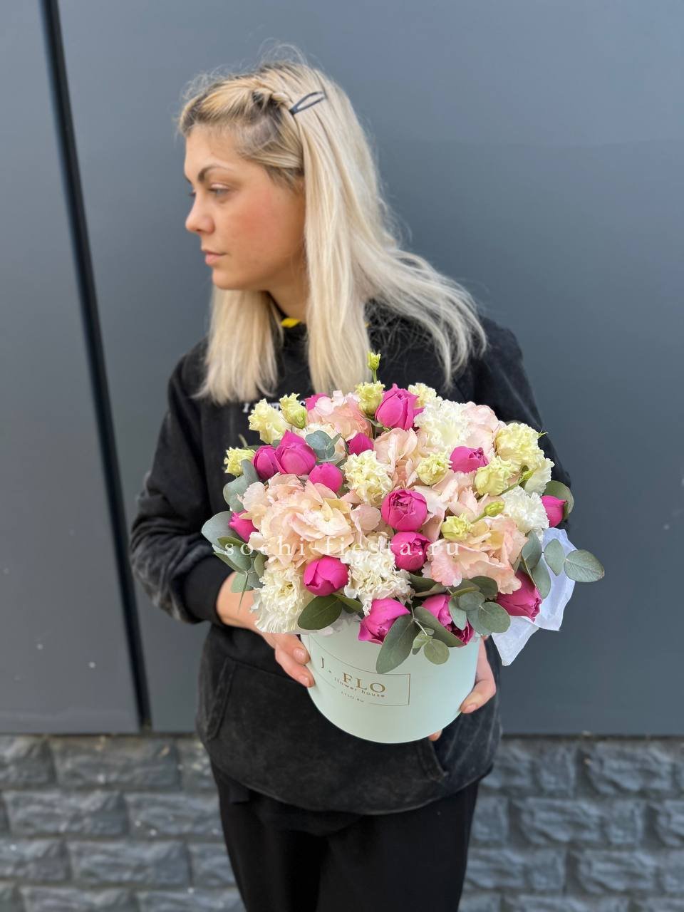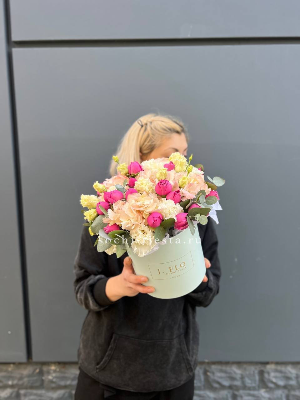 Пионы и гортензии наполняют композицию объемом и мягкой фактурой лепестков. Цилиндр собирает цветы в плотную форму, где каждый бутон находит свое место в общем движении.