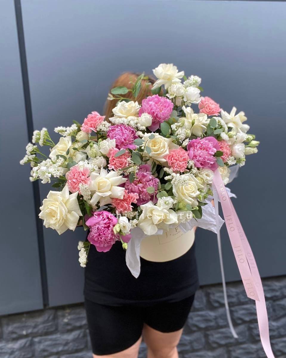 пионы (возможна замена, в зависимости от сезона), статица, эустома, диантус, маттиола, диантусы, цилиндр D20,  лента.