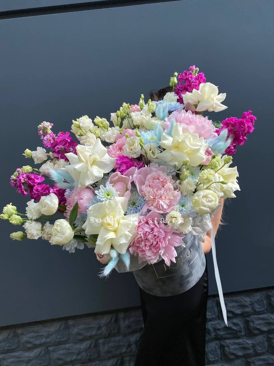 маттиола, пионы, белые розы, эустома, хризантемы, лагурус, бархатный цилиндр D20, эвкалипт, лента, упаковка.