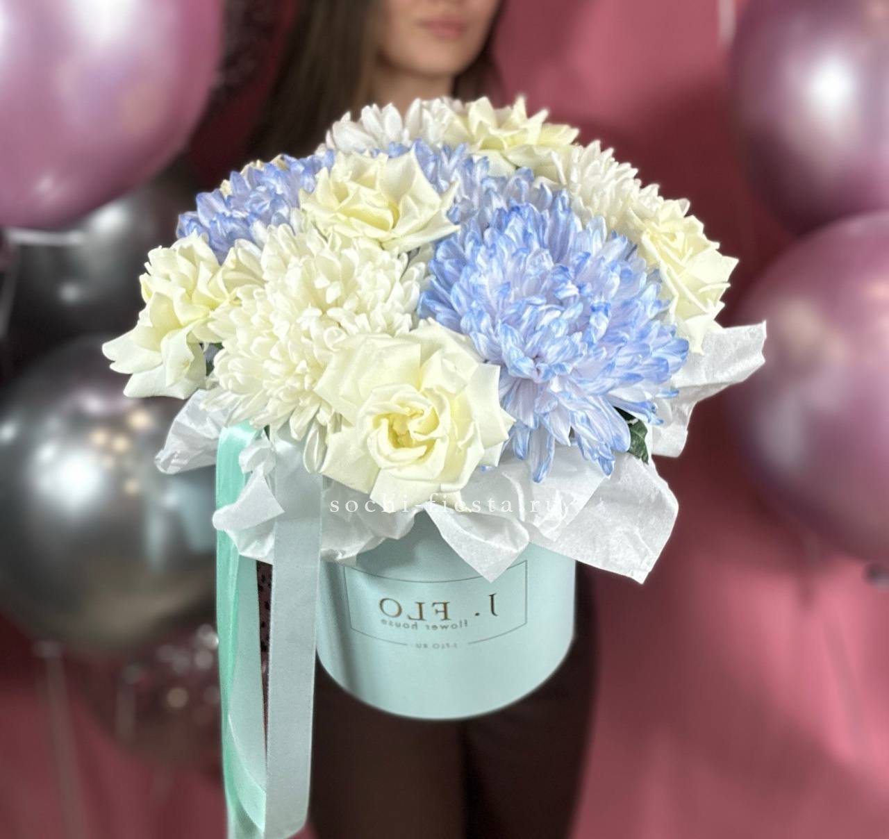 Белые розы с вывернутыми лепестками создают воздушную текстуру в сочетании с хризантемами. Композиция собрана в цилиндре и перевязана лентой. Свежее решение для светлого интерьера.