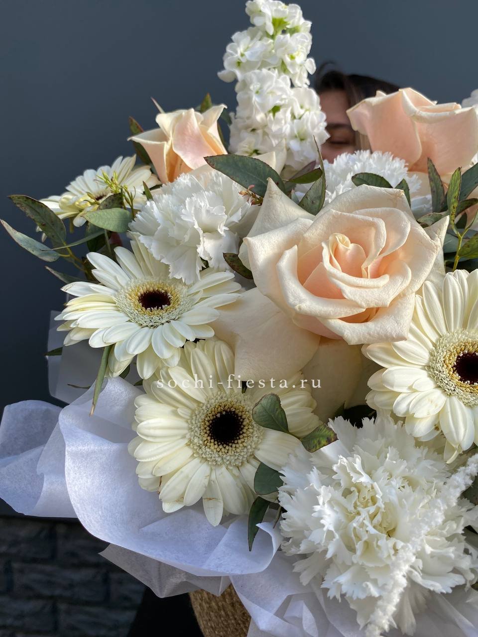 герберы, французские розы, маттиола (аналог), диантусы, амарант и эвкалипт. Цвет роз и диантусов могут отличаться, в тон композиции.