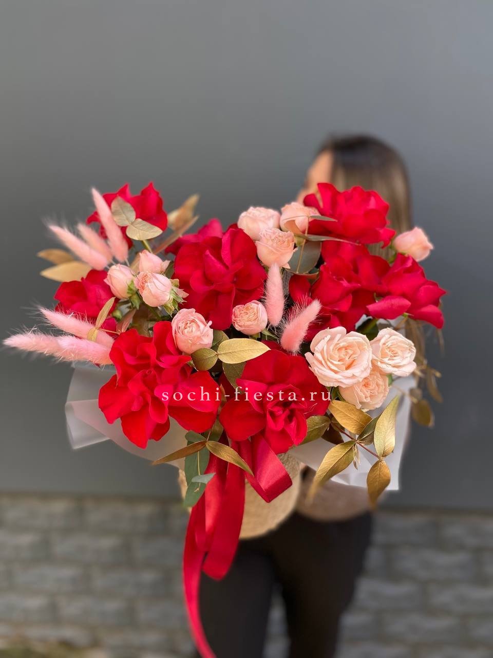 Воздушная гортензия окружает розы пудровых и снежных оттенков, а эвкалипт добавляет глубину и свежесть. Композиция собрана в натуральное джутовое кашпо, которое удобно разместить на столе или подоконнике.