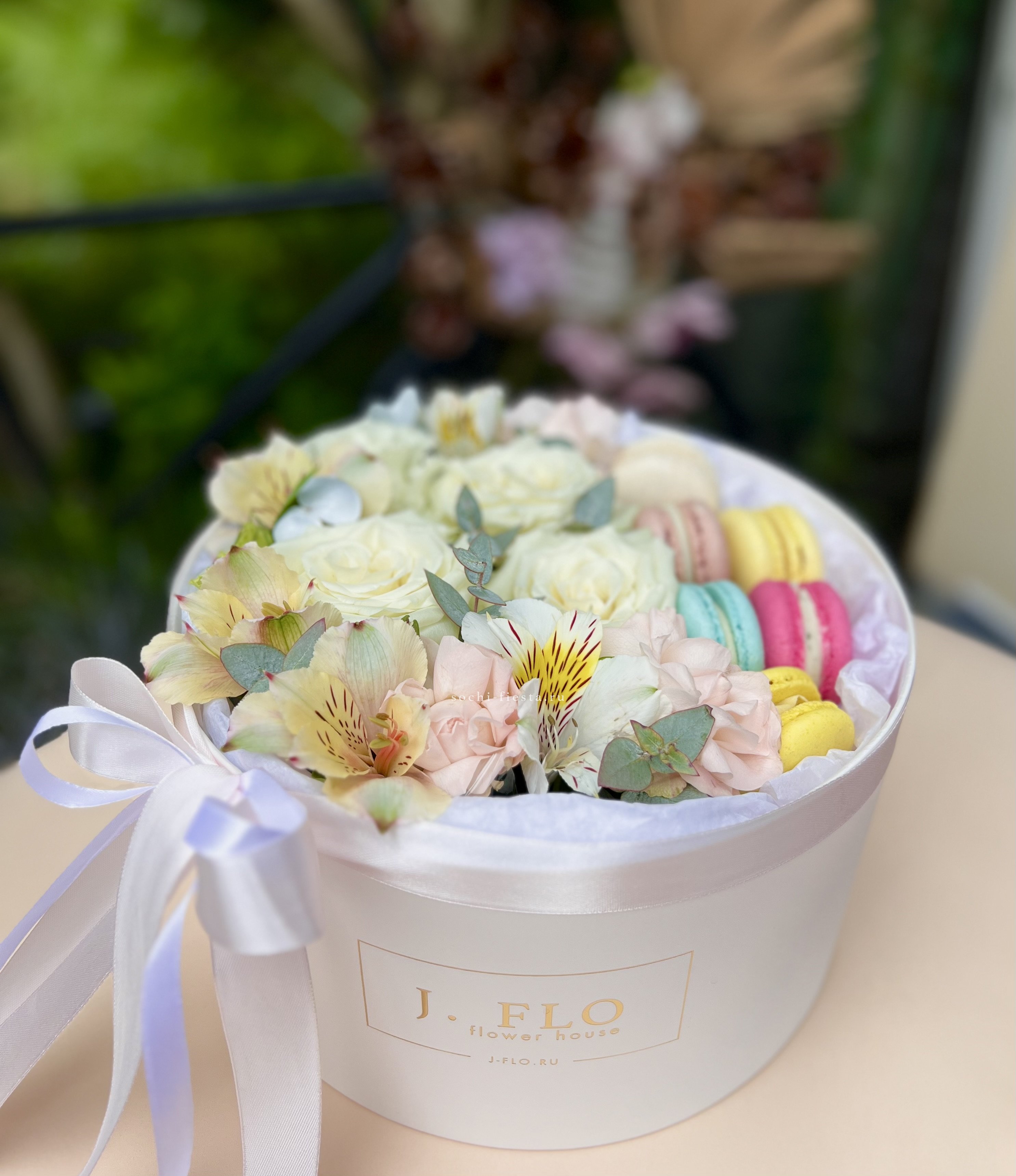 белые розы, альстромерии (по сезону) круглая коробка D20, 6 макаронс.