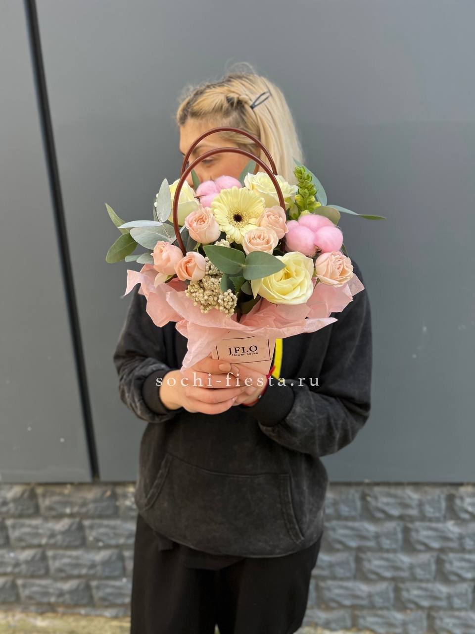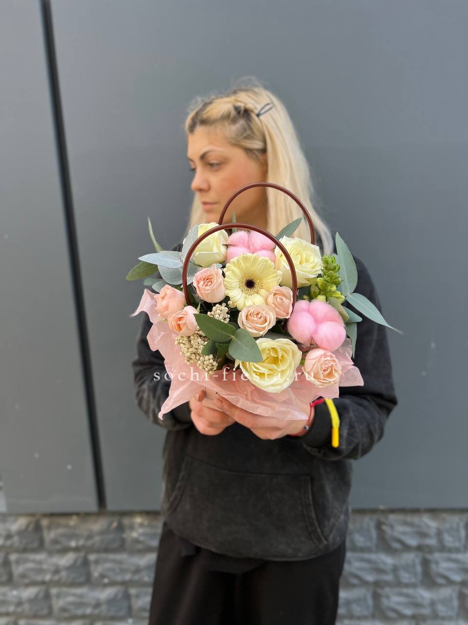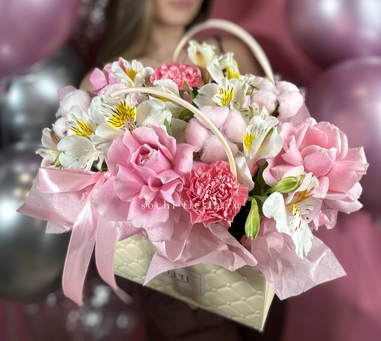 альстромерии (в зависимости от сезона, возможна замена), розовые розы, хлопок, диантусы, лента, сумка-кашпо.