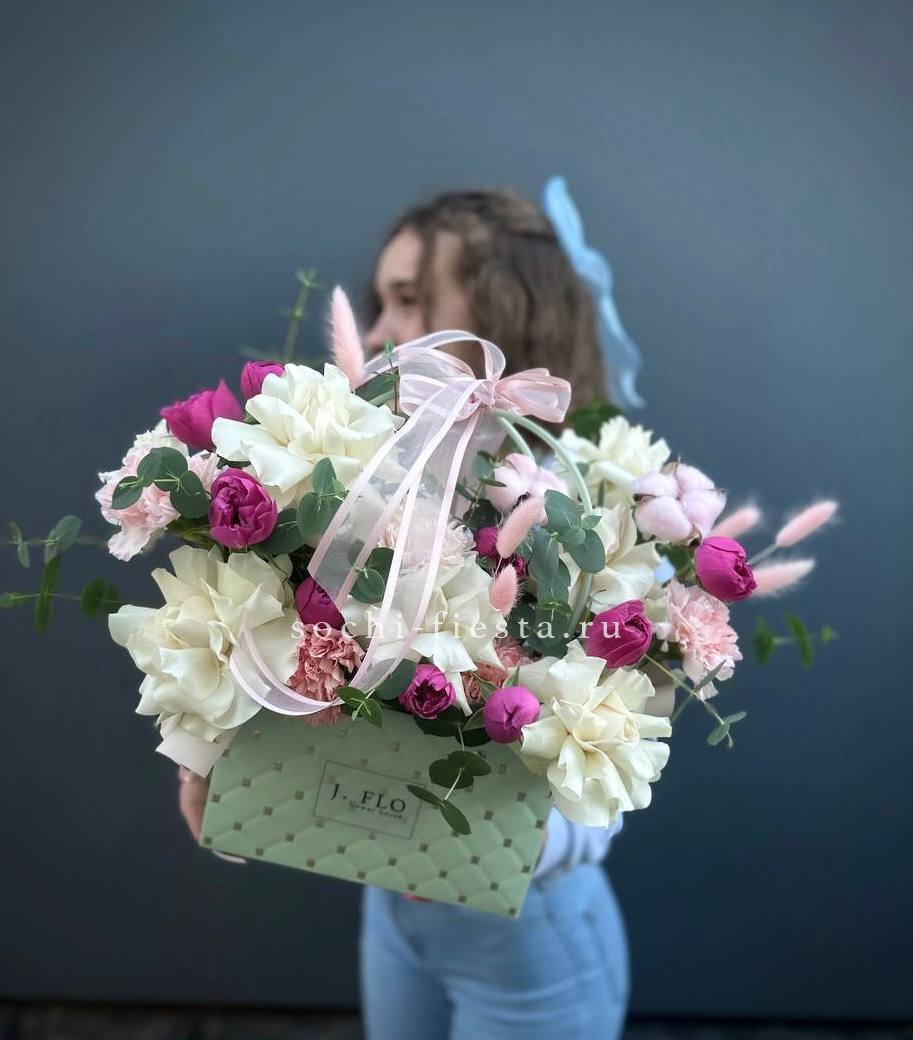 гортензия, джумилия, гербера, сумочка.