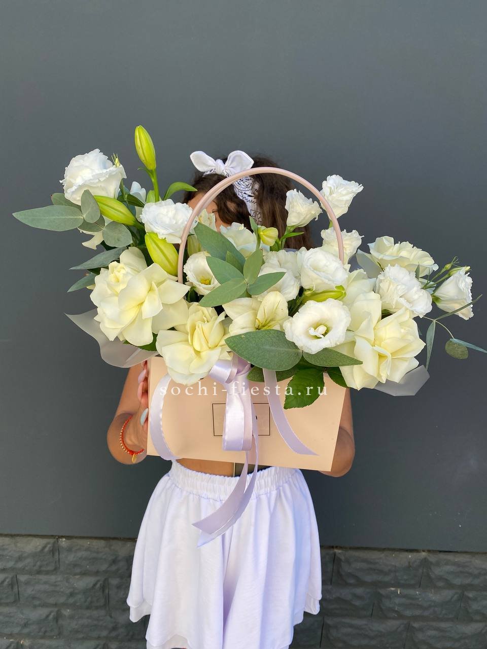 сумочка с гортензией, мисти баблс, герберой, озатамусом и эвкалиптом.