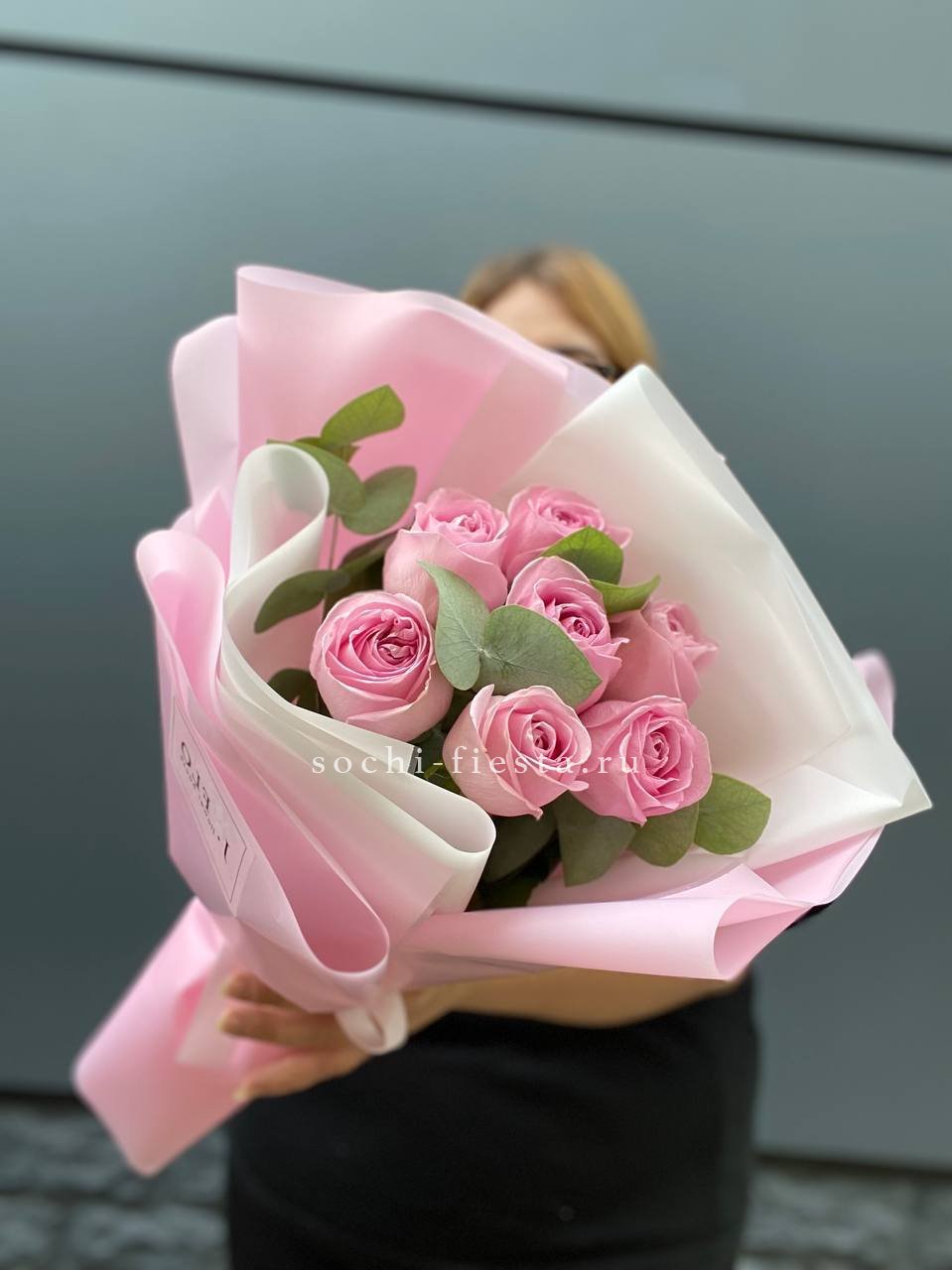 Розовые оттенки переплетаются с пыльной зеленью эвкалипта. Семь бутонов создают мягкое цветовое пятно, которое успокаивает взгляд.