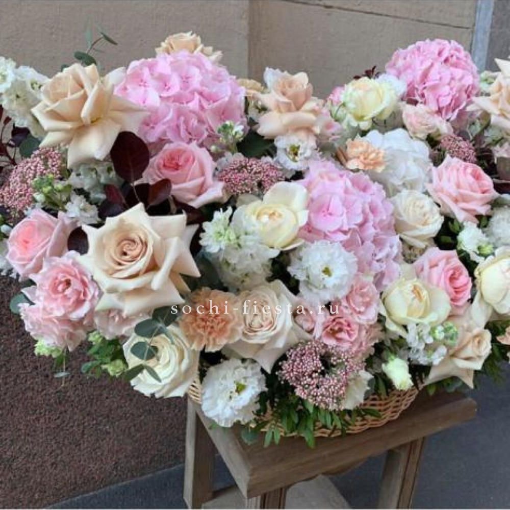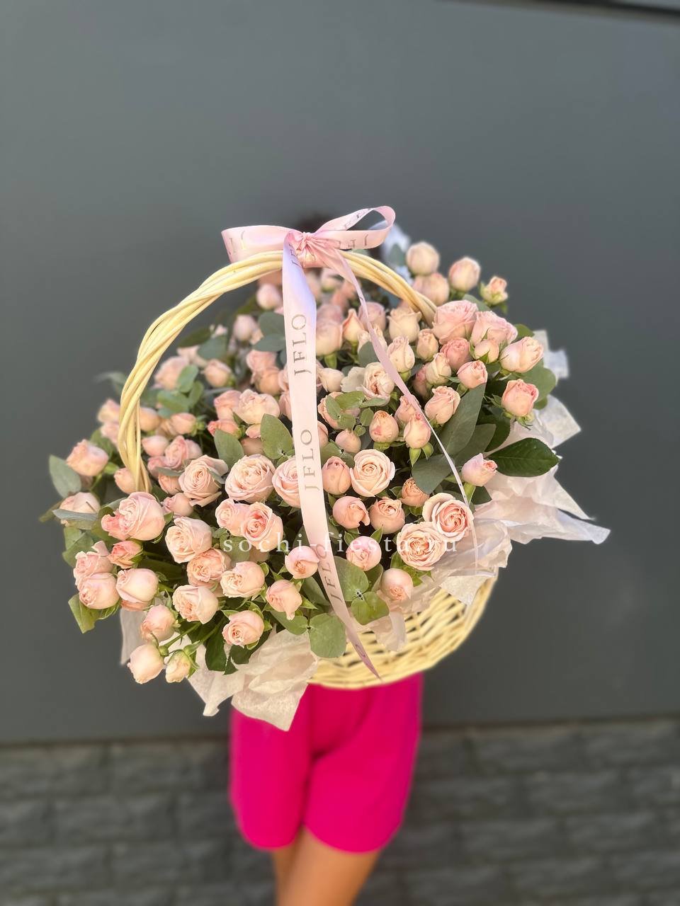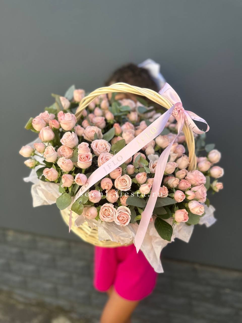 Двадцать пять французских роз в корзине создают плавный переход от светлых розовых тонов к насыщенной фуксии. Эвкалипт добавляет свежести и завершает композицию естественной зеленью. Букет удобно разместить на столе или комоде благодаря устойчивой корзине.