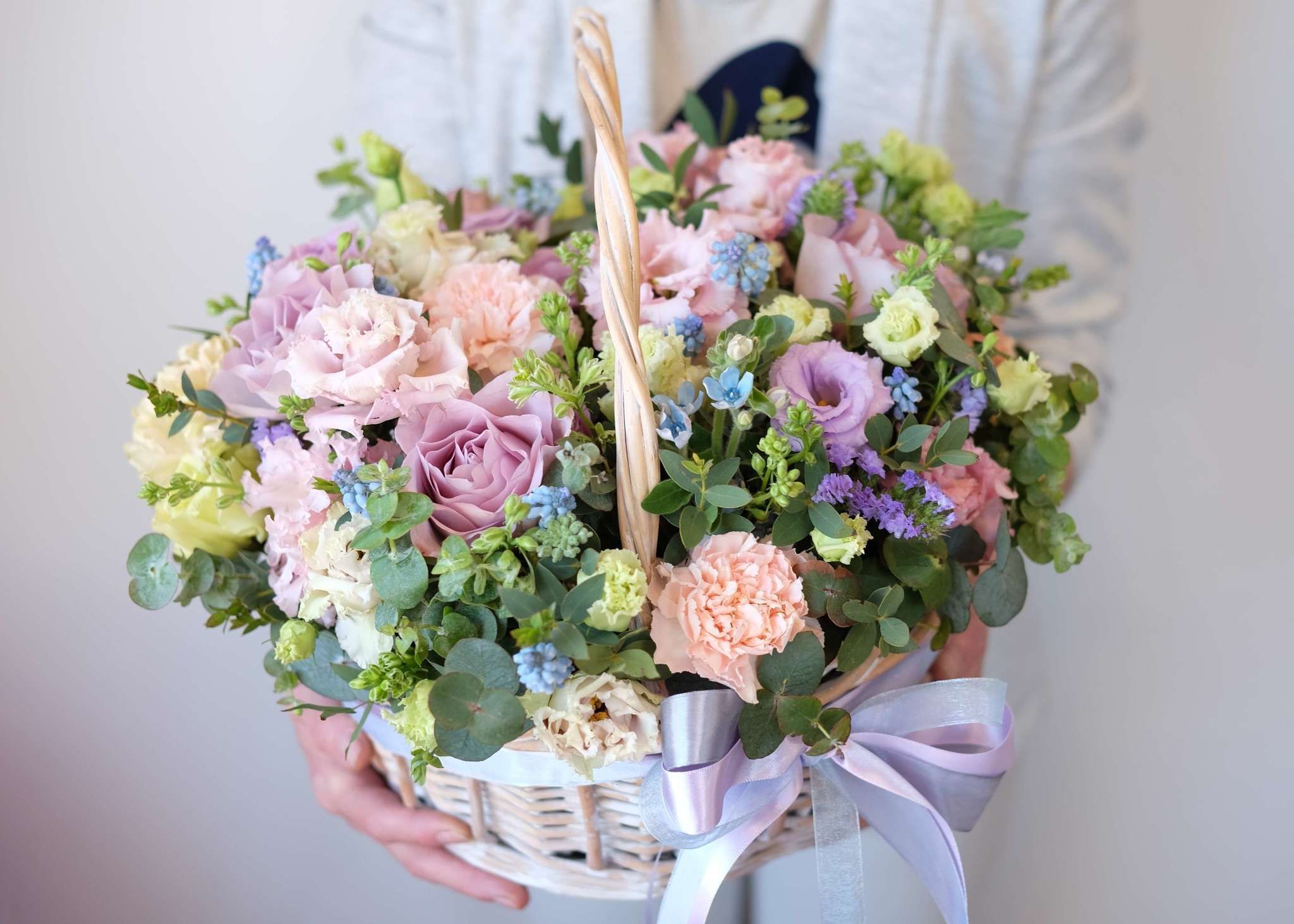 Плетеная корзина вмещает густую композицию из лилий с добавлением эвкалипта. Объемная форма создает впечатление цветущего сада, собранного в одном месте.