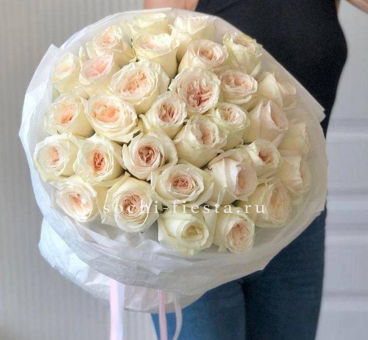 розы, диантусы, пионовидные кустовые розы, гортензия, эвкалипт, вспомогательная зелень, лента, дизайнерская упаковка.