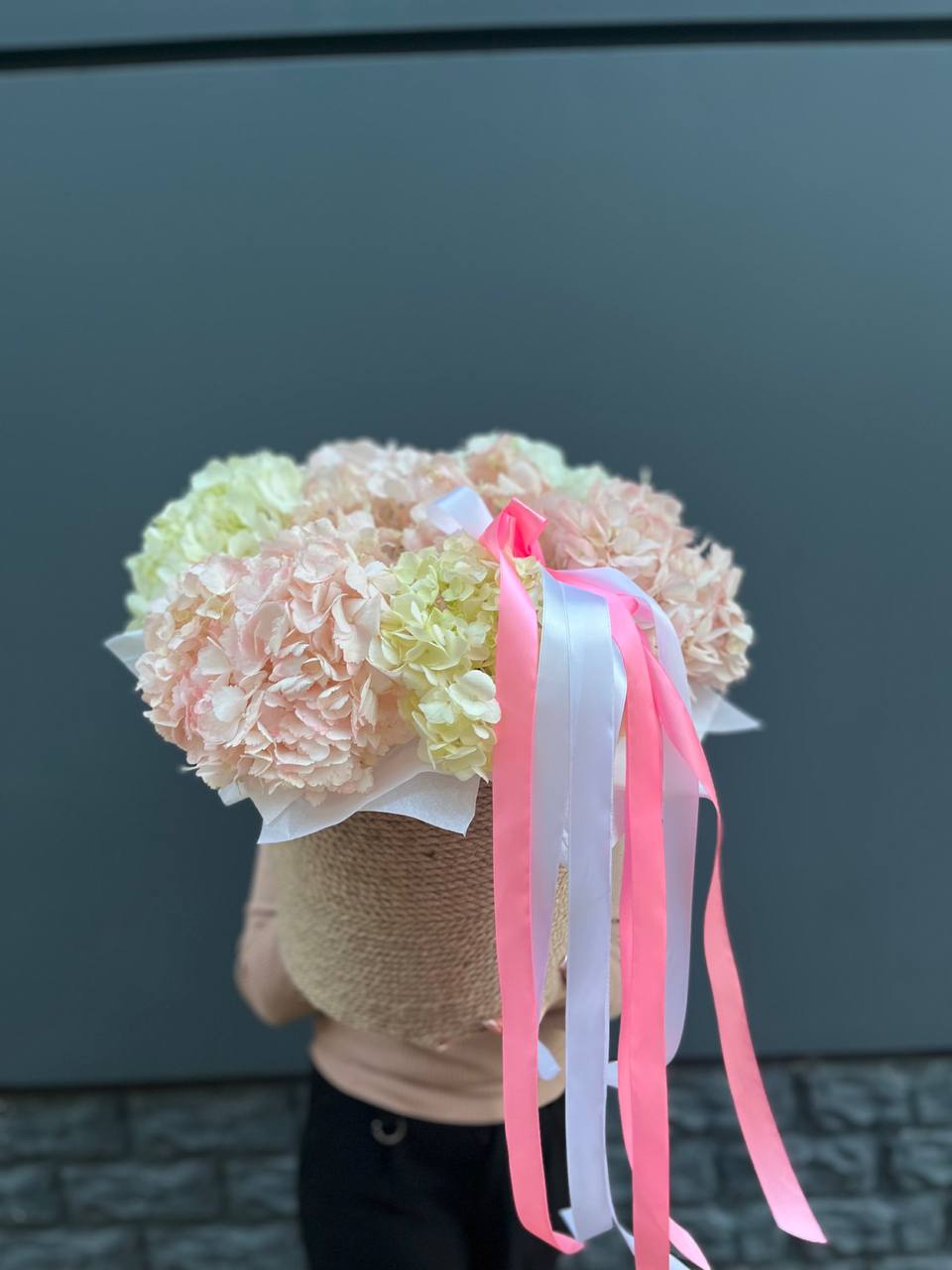 Пятьдесят один бутон Мисти Баблс собраны в плетёную корзину и образуют плотную цветущую полусферу. Лавандовые оттенки раскрываются постепенно и держат форму долго.